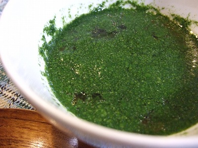 | 3. | 水500ccとブイヨン加え、煮立ったらみじん切りにしたモロヘイヤを加える。 |
