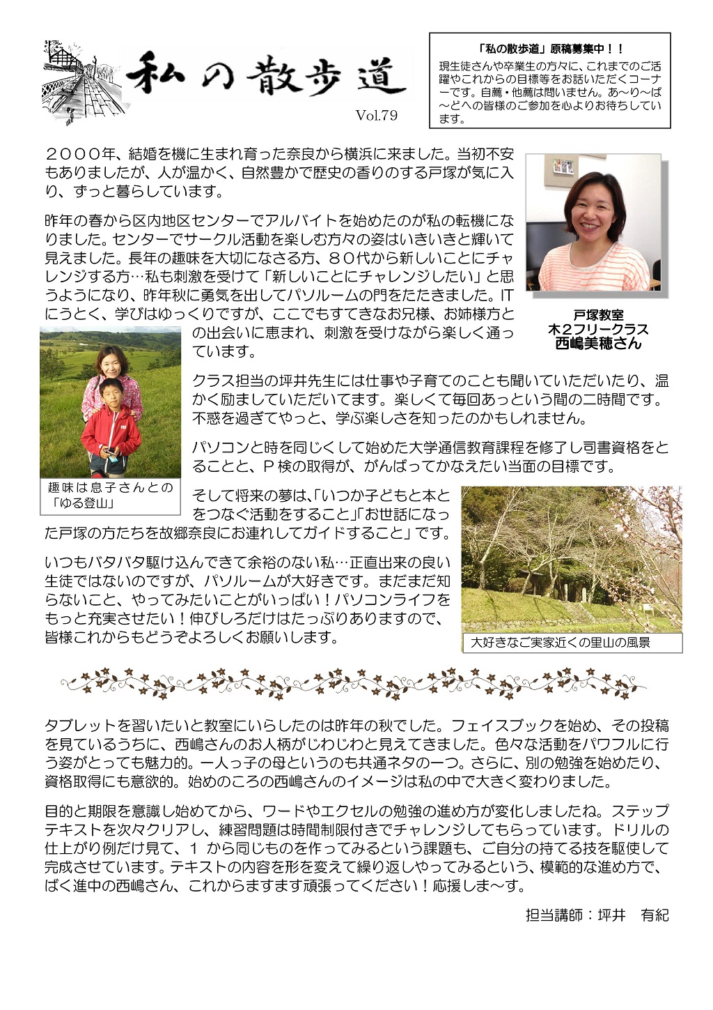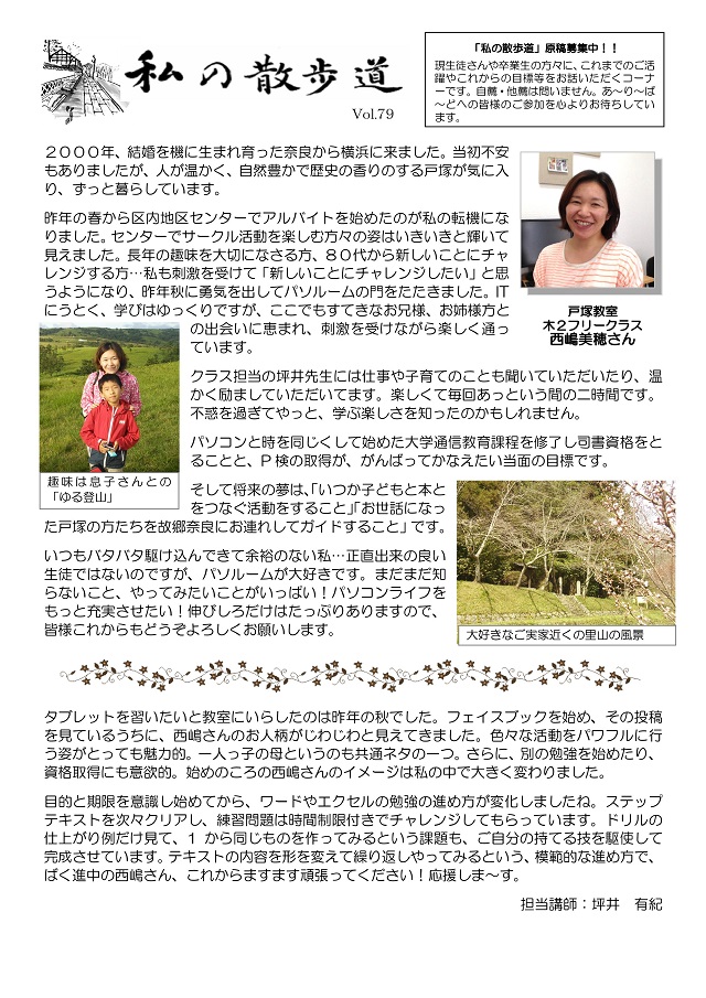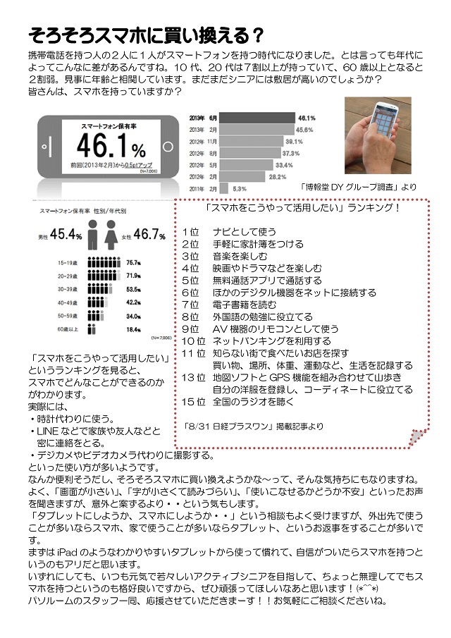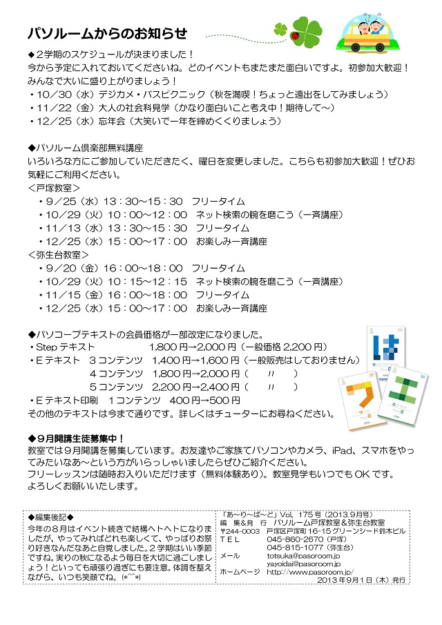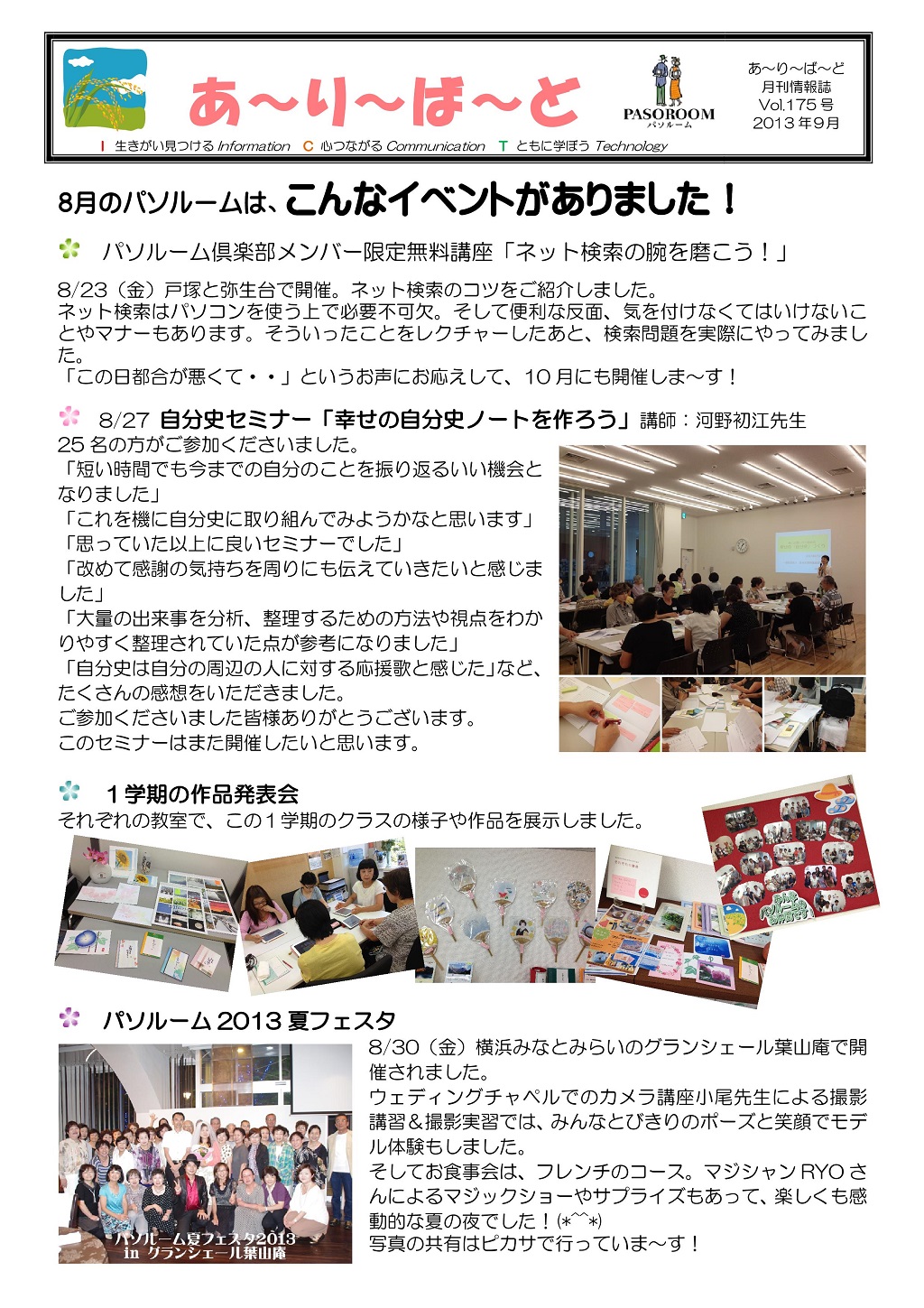 HOME > あ~り~ば~ど > あ~り~ば~ど 2013年9月号 Vol.175 あ~り~ば~ど 2013年9月号 Vol.175 今月の内容 8月のパソルームは、こんなイベントがありました! そろそろスマホに買い換える? 私の散歩道 戸塚教室 西嶋 美穂さん パソルームからのお知らせ