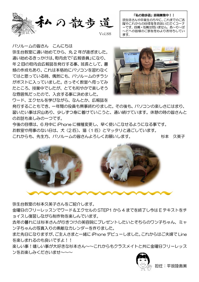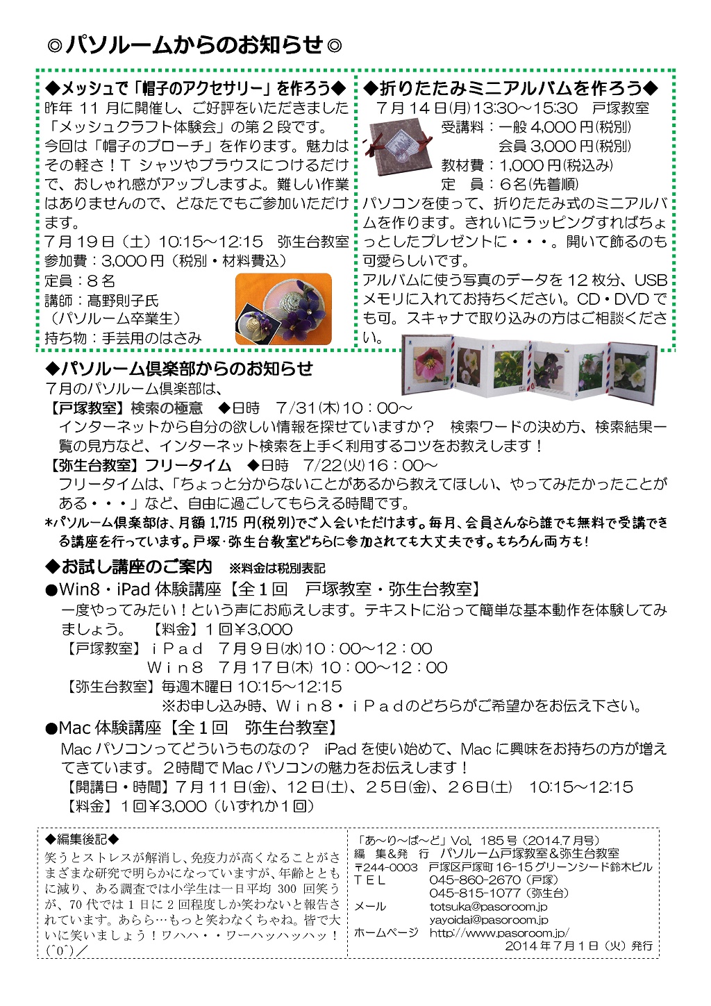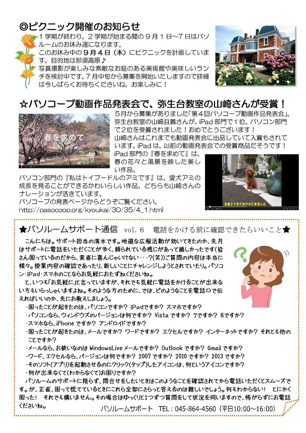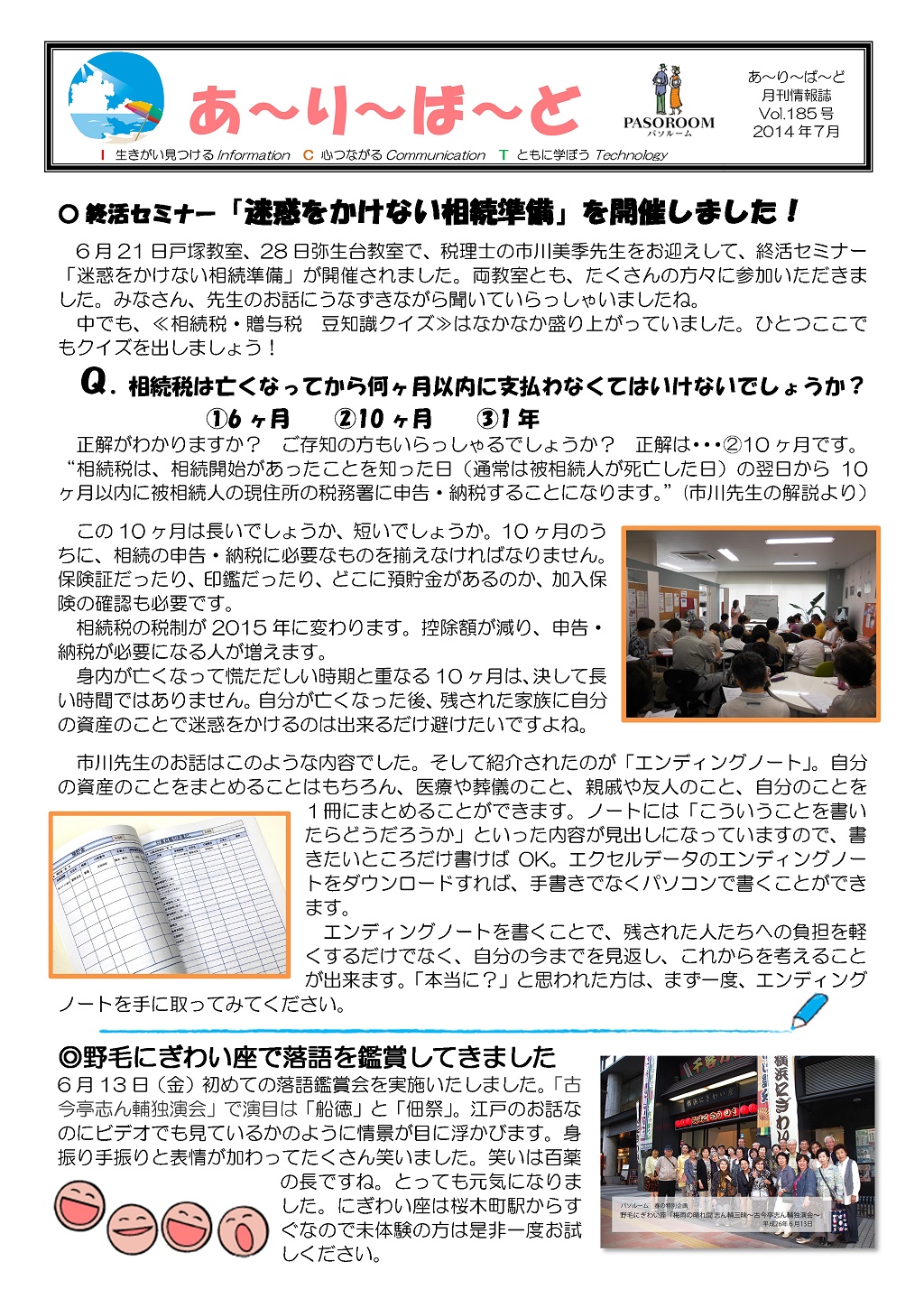 HOME > あ~り~ば~ど > あ~り~ば~ど 2014年7月号 Vol.185 あ~り~ば~ど 2014年7月号 Vol.185 今月の内容 「迷惑をかけない相続準備」を開催しました野毛にぎわい座で落語を鑑賞してきました ピクニック開催のお知らせパソコープ動画作品発表会で、弥生台教室の山崎さんが受賞!★パソルームサポート通信 vol.6.電話をかける前に確認できたらいいこと★ 私の散歩道 弥生台教室 杉本 久美子さん パソルームからのお知らせ