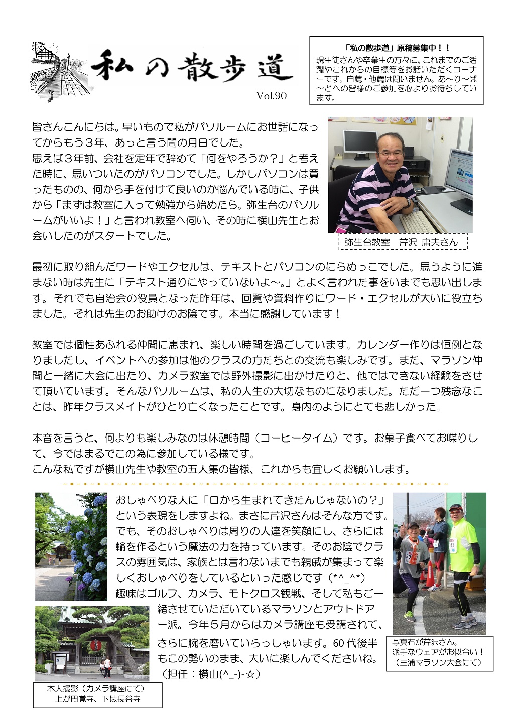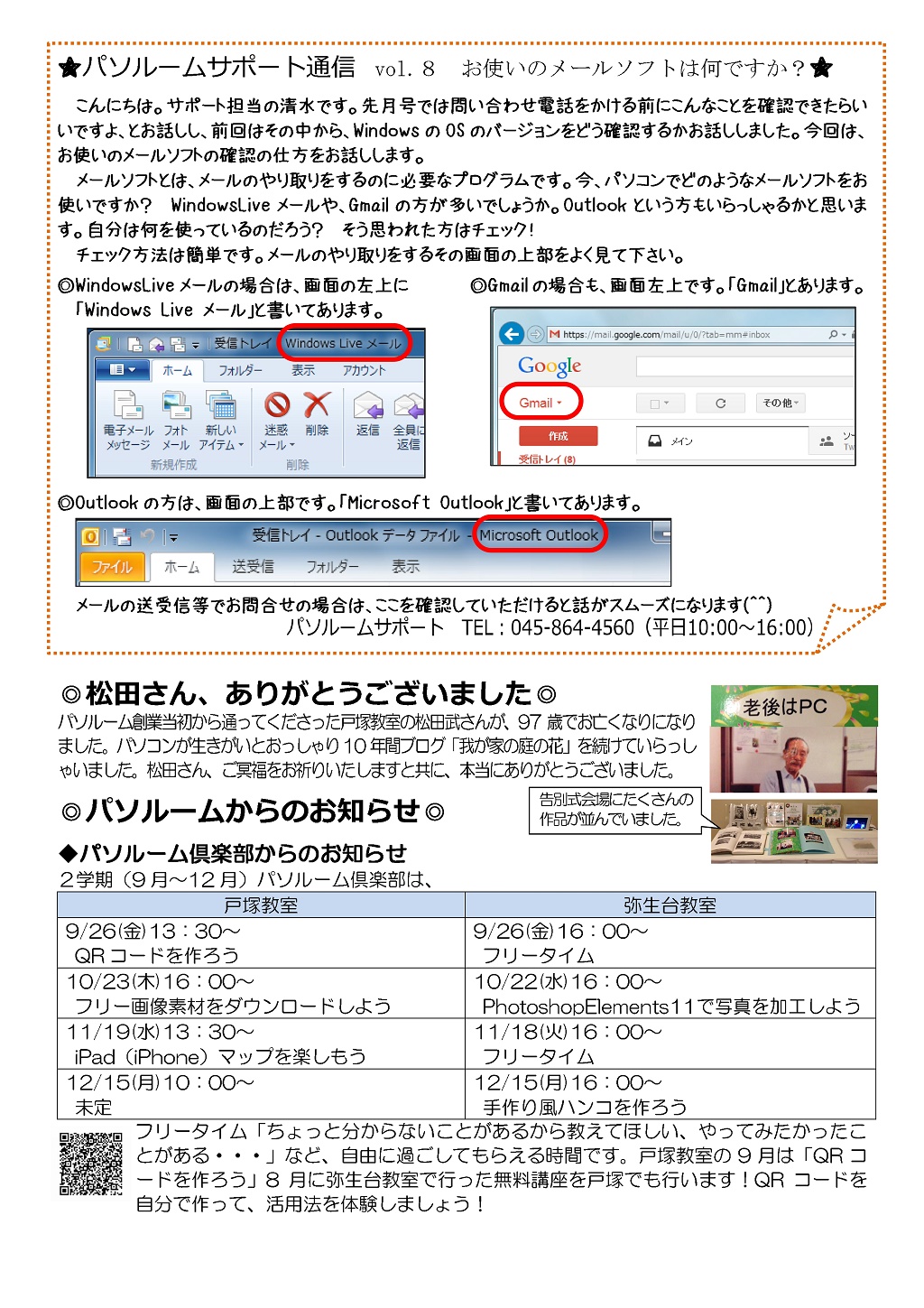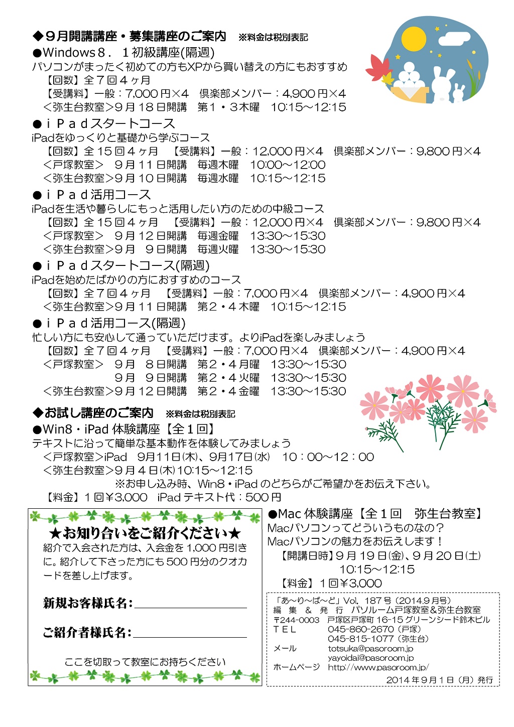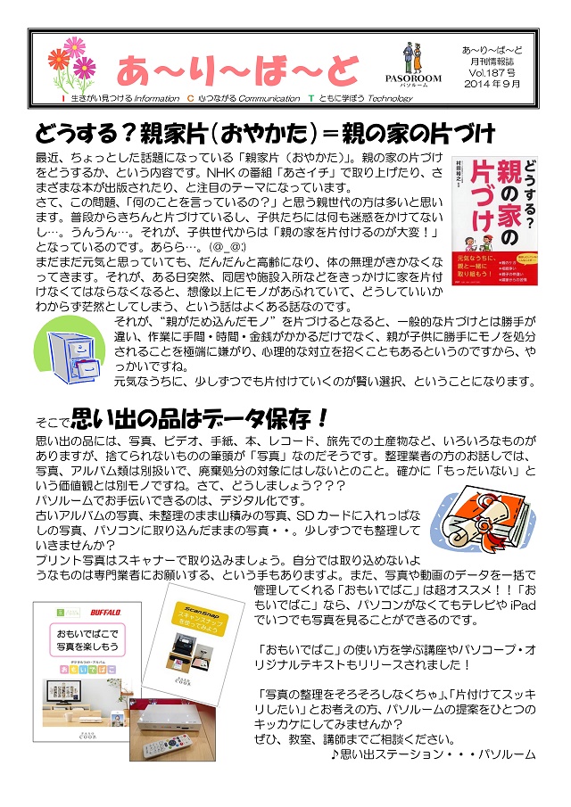 HOME > あ~り~ば~ど > あ~り~ば~ど 2014年9月号 Vol.187 あ~り~ば~ど 2014年9月号 Vol.187 今月の内容 どうする?親家片(おやかた)=親の家の片づけ 私の散歩道 弥生台教室 芹沢 庸夫さん ★パソルームサポート通信 vol.8.お使いのメールソフトは何ですか?★松田さん、ありがとうございましたパソルームからのお知らせ(パソルーム倶楽部からのご案内) パソルームからのお知らせ(9月開講講座・募集講座のご案内)