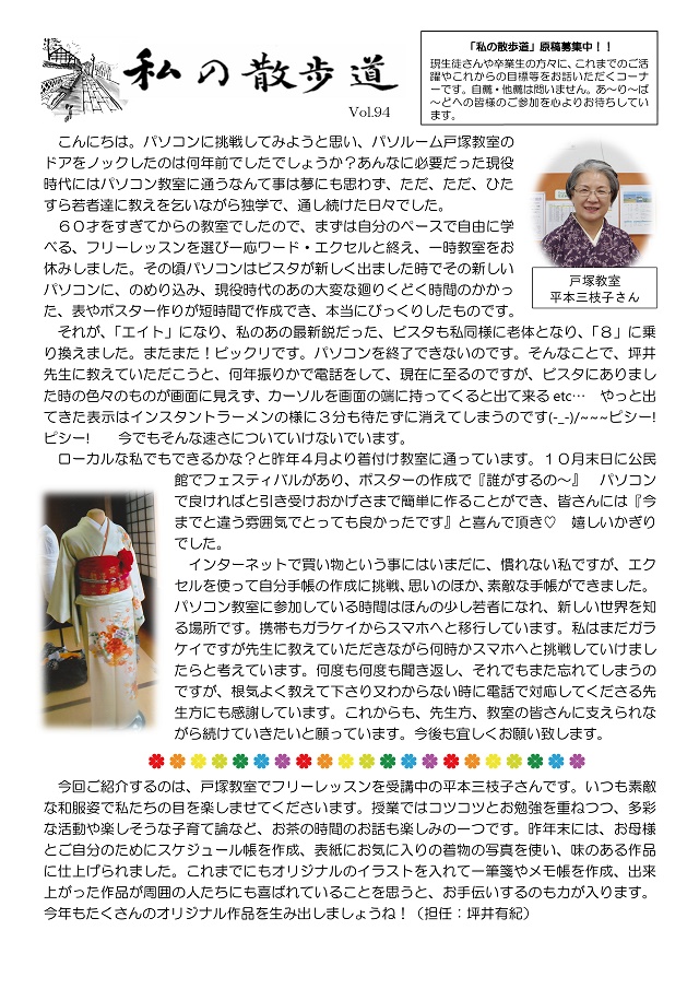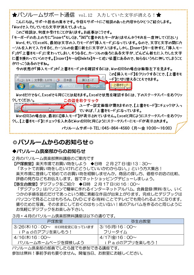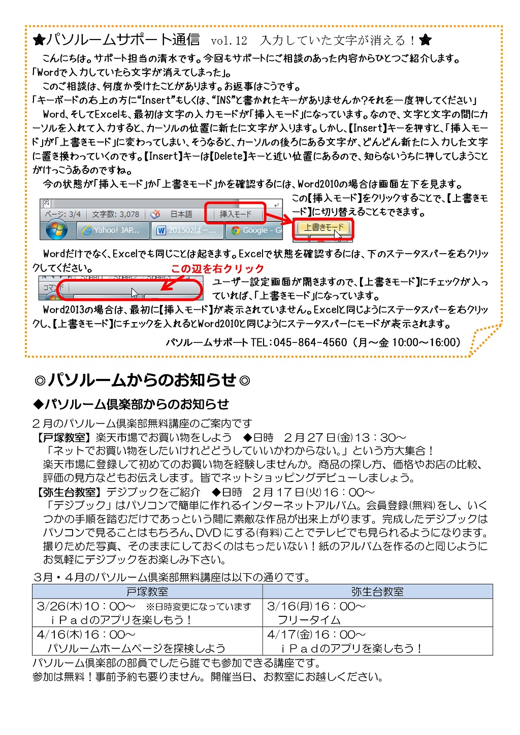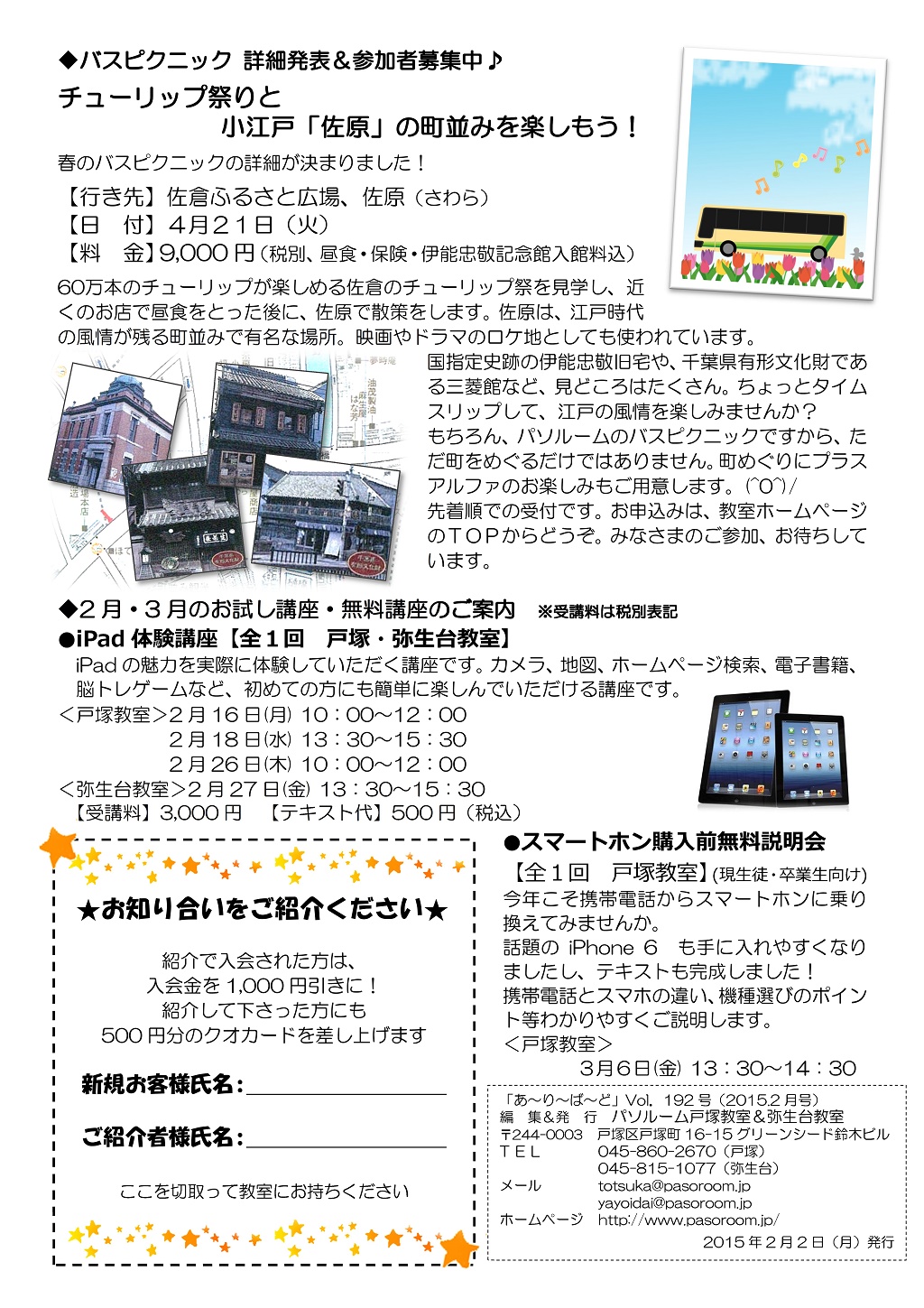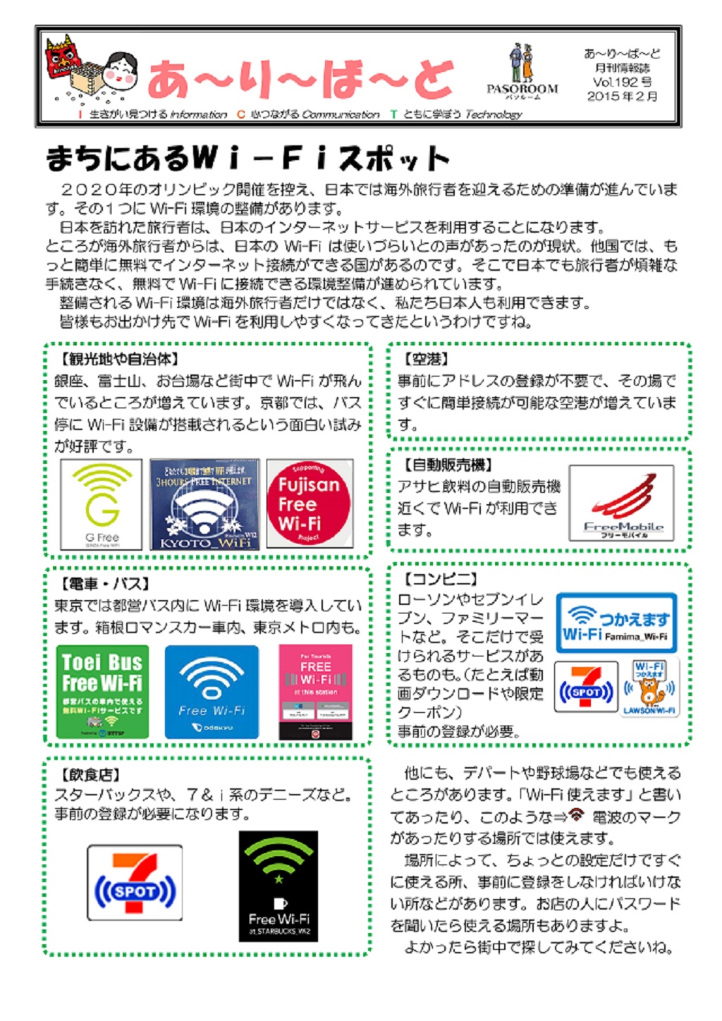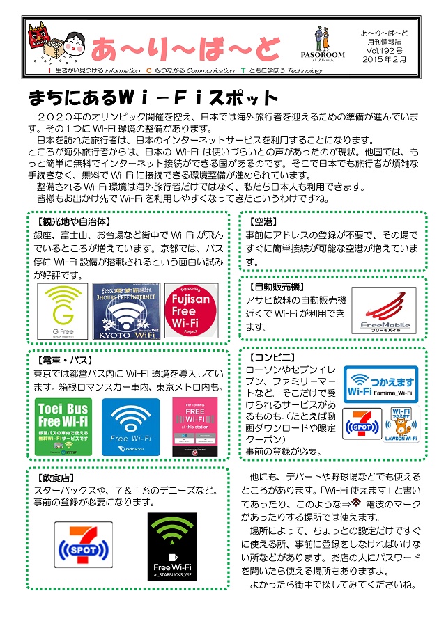 HOME > あ~り~ば~ど > あ~り~ば~ど 2015年2月号 Vol.192 あ~り~ば~ど 2015年2月号 Vol.192 今月の内容 まちにあるWi-Fiスポット(^-^*)/ 私の散歩道 戸塚教室 平本 三枝子さん ★パソルームサポート通信 vol.12.入力していた文字が消える!★パソルーム倶楽部無料講座のご案内 バスピクニックチューリップ祭りと小江戸「佐原」の町並みを楽しもう! 2月・3月のお試し講座・無料講座のご案内