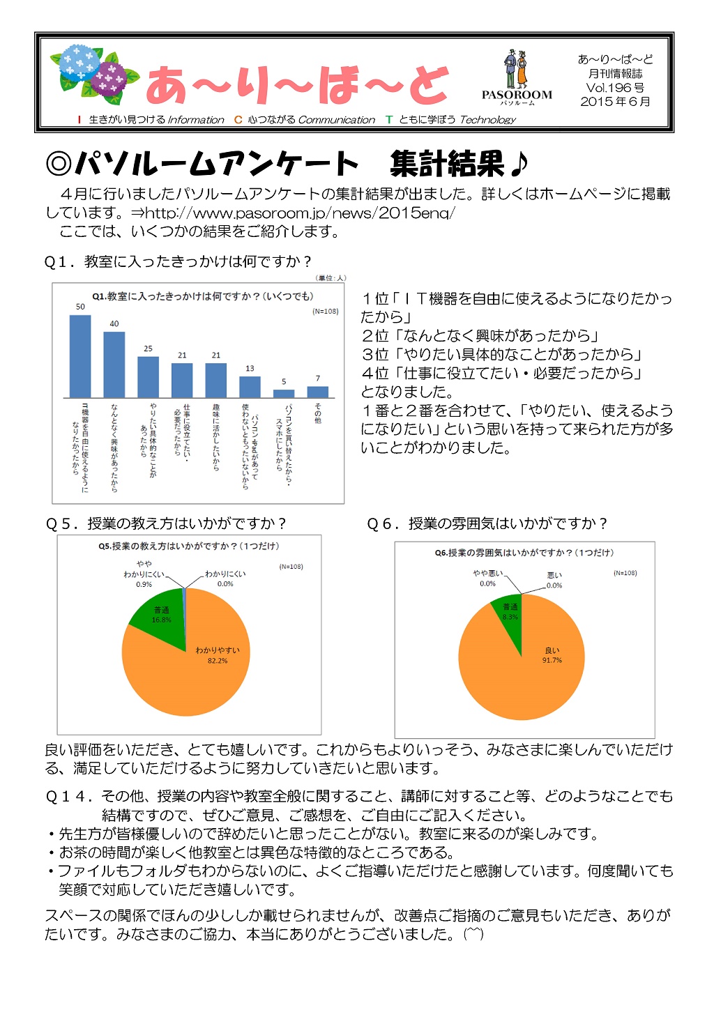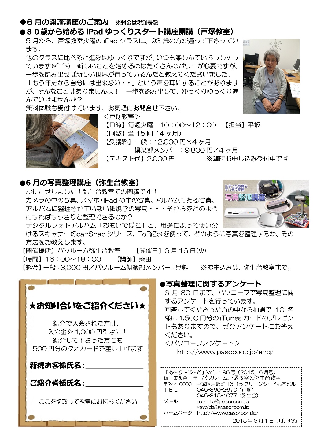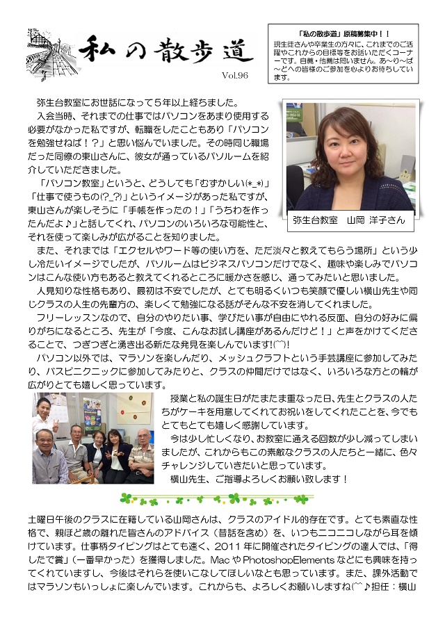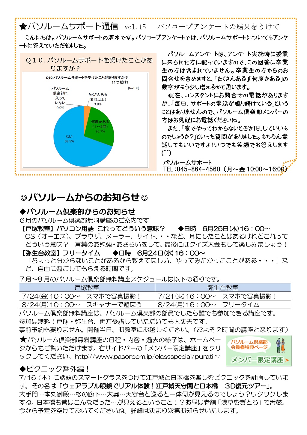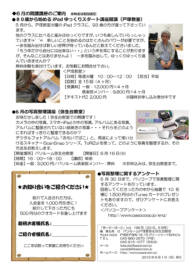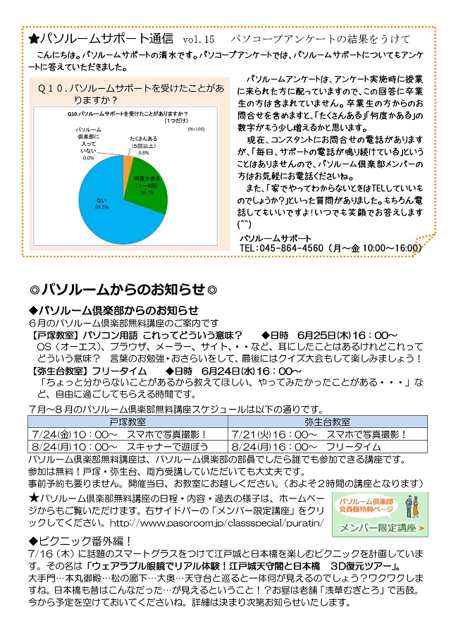 HOME > あ~り~ば~ど > あ~り~ば~ど 2015年6月号 Vol.196 あ~り~ば~ど 2015年6月号 Vol.196 今月の内容 パソルームアンケート 集計結果♪ 私の散歩道 弥生台教室 山岡 洋子さん ★パソルームサポート通信 vol.15 パソコープアンケートの結果をうけて★パソルーム倶楽部無料講座のご案内ピクニック番外編!「ウェアラブル眼鏡でリアル体験!江戸城天守閣と日本橋 3D復元ツアー」 6月の開講講座のご案内パソコープ 写真整理に関するアンケート