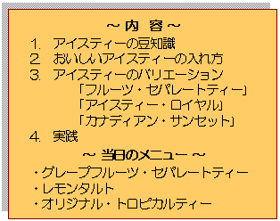 ベースのアイスティーの作り方はじめ、2層3層に分ける、オシャレで美味しいアイスティーのバリエーションもご紹介していきます。きっと夏のおもてなしに自信がもてるようになるはずです!またサクサクのレモンタルトや香り豊かなトロピカルティーもご用意いたします。