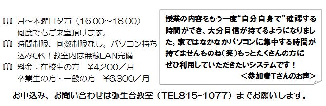 おかげさまでただ今3名の方にご利用いただき、弥生台教室は夕方も