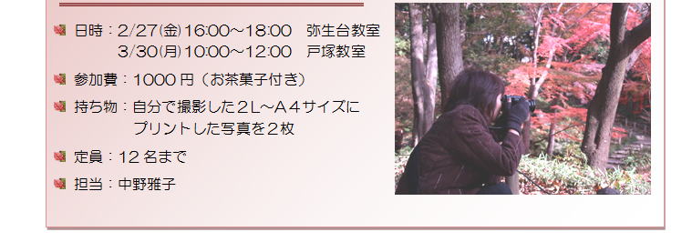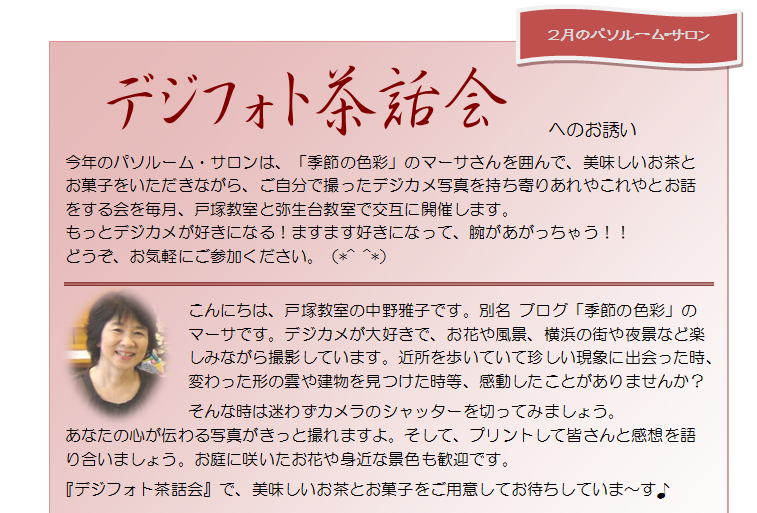 たくさんのことを教わり、とても楽しみにしております。今年もデジカメで写真をたくさん撮りましょうね!