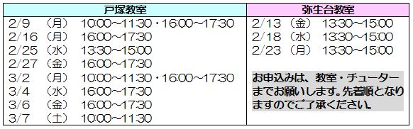 弥生台教室 2/21(土)10:15〜 ・ 2/28(土)13:30〜
