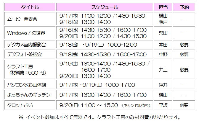 イベント:ムービー発表会・Windows7の世界・デジカメ室内撮影会・デジフォト茶話会・