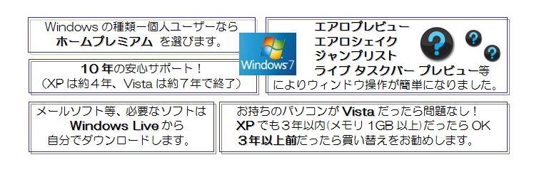 動作が速く操作が簡単!と前評判の高いウィンドウズ7。そのキーワードを挙げてみました。