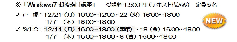 発売されたばかりのWindows7の新機能をご紹介する講座を1500円で行います。