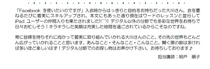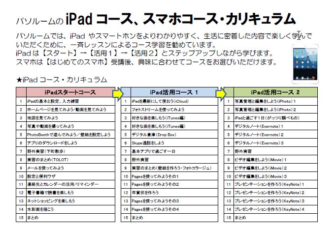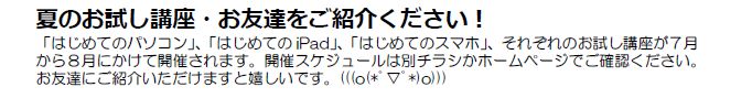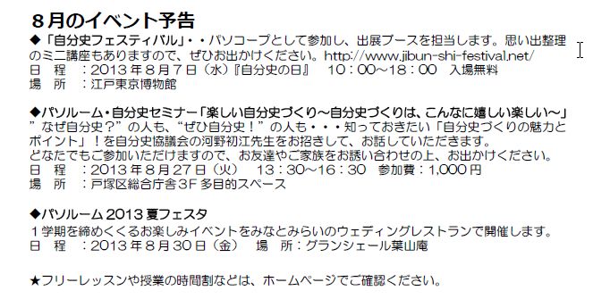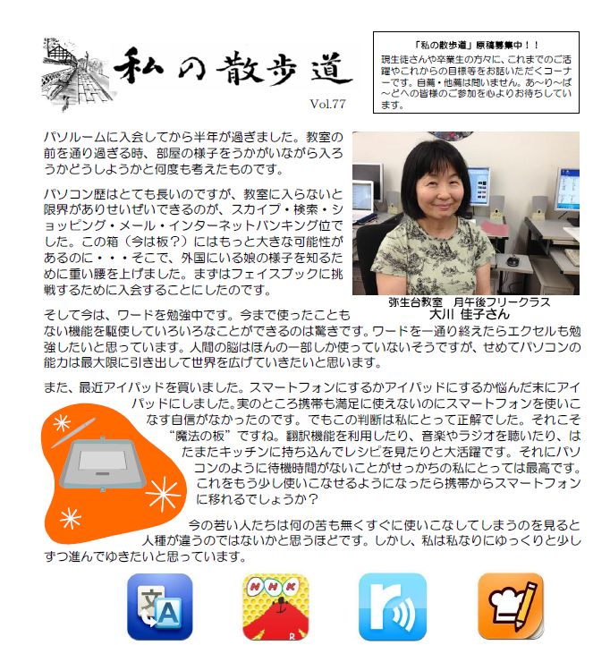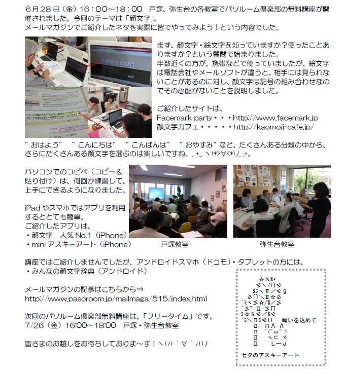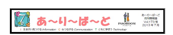 HOME > あ~り~ば~ど > あ~り~ば~ど 2013年7月号 Vol.173 あ~り~ば~ど 2013年7月号 Vol.173 今月の内容 6月パソルーム倶楽部「顔文字で気持ちを伝えよう」が開催されました! パソルームの iPadコース、スマホコース・カリキュラム 私の散歩道 弥生台教室 大川 佳子さん 7月のスポット講座 夏のお試し講座・お友達をご紹介ください! 8月のイベント予告