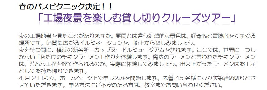45名 先着順 ※4/2(月)午前8時にブログにて申し込みページを発表します |