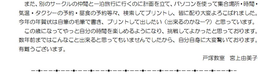 「教室で、皆様とともに歩んでまいりましたが、この度都合によりしばらくの間