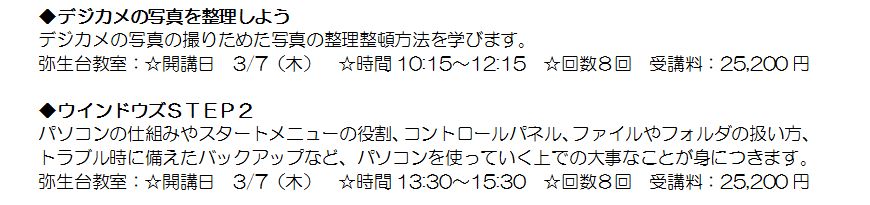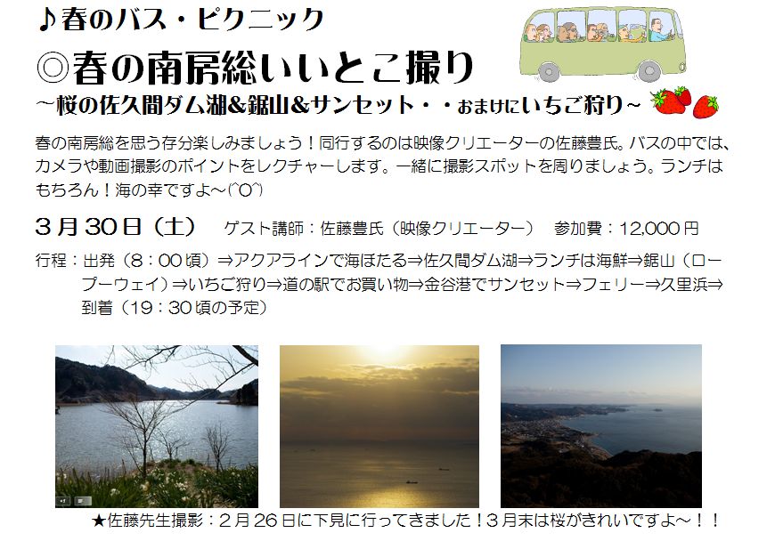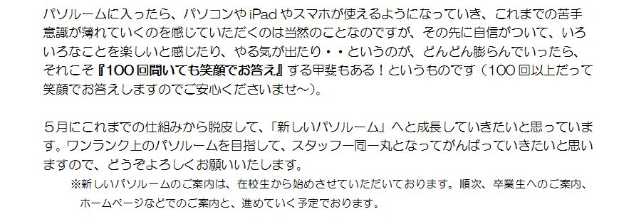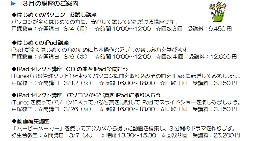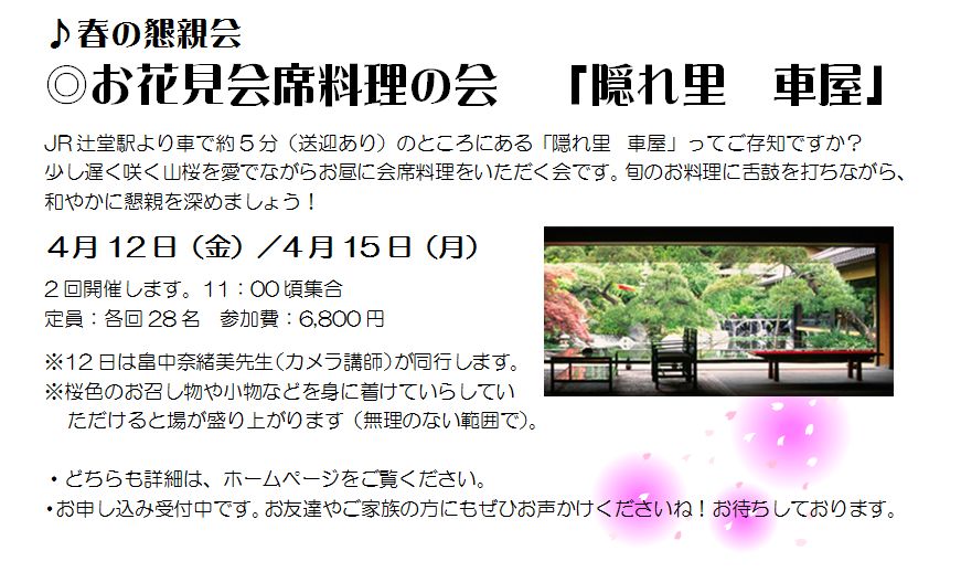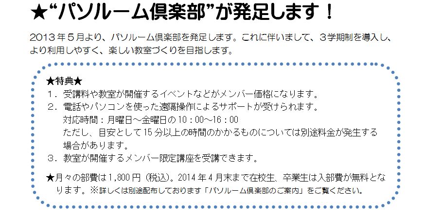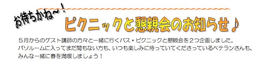 5月からの新しいパソルームのご案内や春のピクニック、懇親会のお知らせ、新しいカメラ講座の