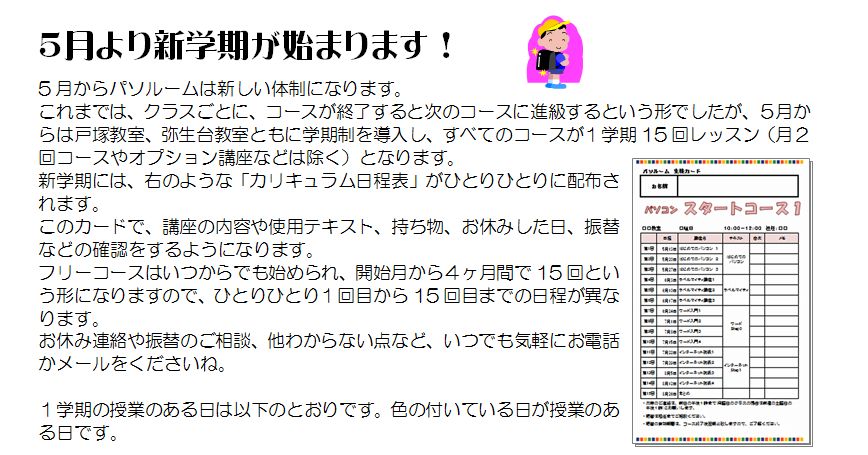 さて、5月からの新しいパソルームに講師一同少々緊張しております。