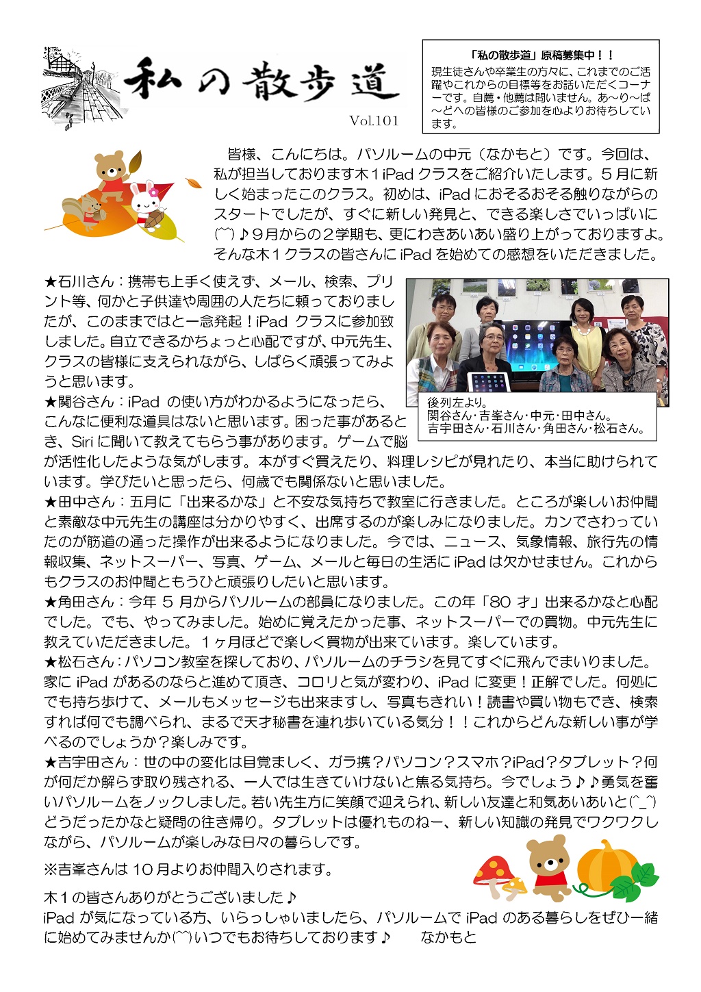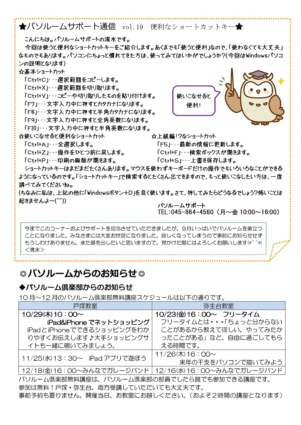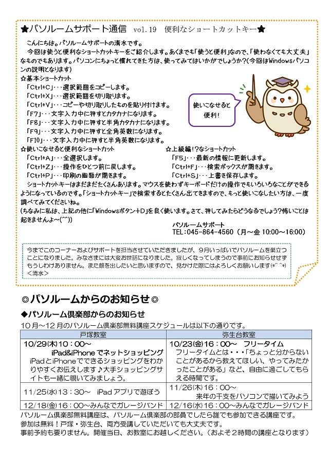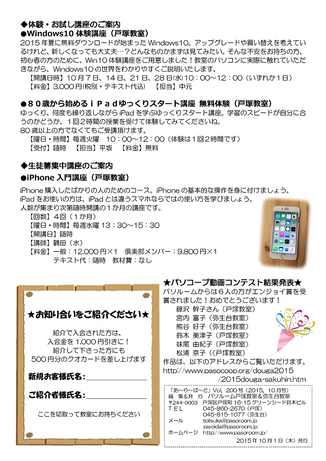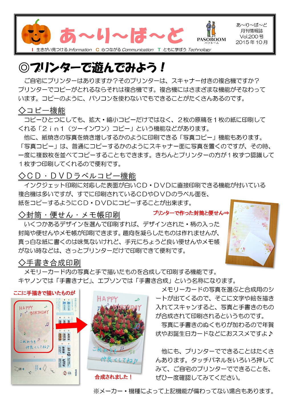 HOME > あ~り~ば~ど > あ~り~ば~ど 2015年10月号 Vol.200 あ~り~ば~ど 2015年10月号 Vol.200 今月の内容 プリンターで遊んでみよう! 私の散歩道 戸塚木1iPadクラスをご紹介いたします ★パソルームサポート通信 vol.19 便利なショートカットキー★パソルーム倶楽部無料講座のお知らせ 体験・お試し・生徒募集中講座のご案内パソコープ動画コンテスト結果発表