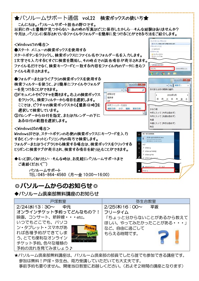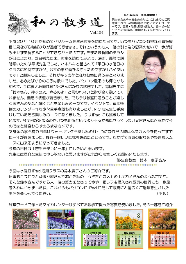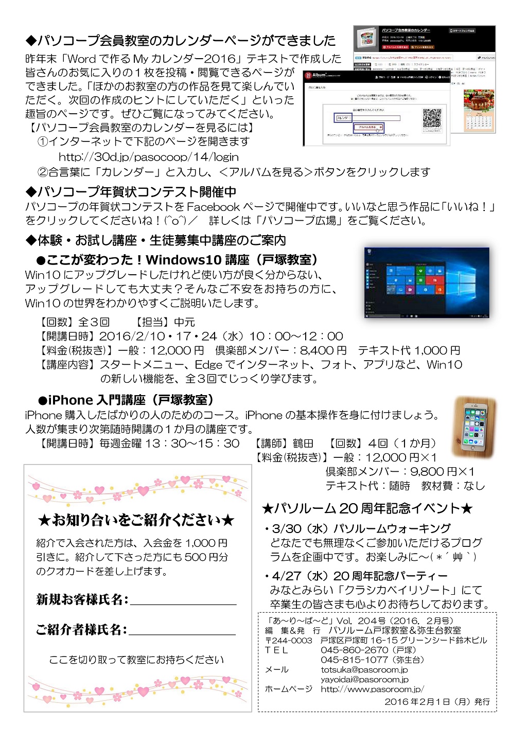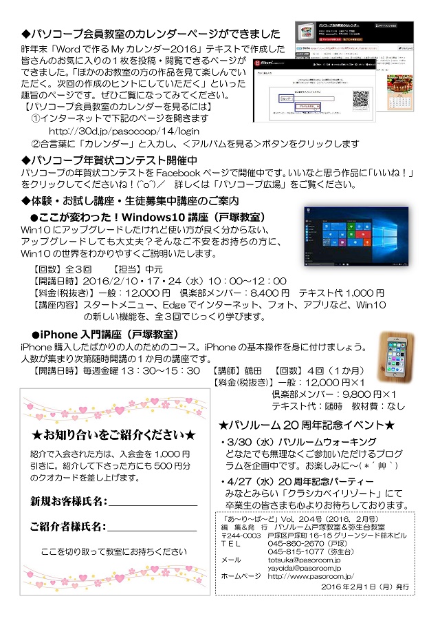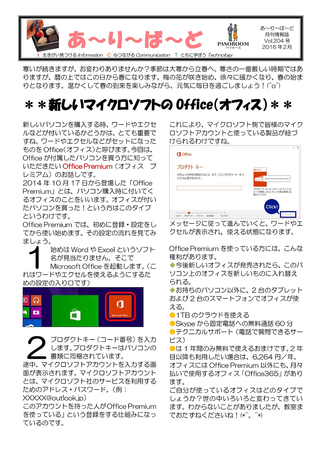 HOME > あ~り~ば~ど > あ~り~ば~ど 2016年2月号 Vol.204 あ~り~ば~ど 2016年2月号 Vol.204 今月の内容 **新しいマイクロソフトのOffice(オフィス)** 私の散歩道 弥生台教室 鈴木 廣子さん ★パソルームサポート通信 vol.22 検索ボックスの使い方★パソルーム倶楽部無料講座のお知らせ パソコープ会員教室のカレンダーページができましたパソコープ年賀状コンテスト開催中体験・お試し・生徒募集中講座のご案内パソルーム20周年記念イベント