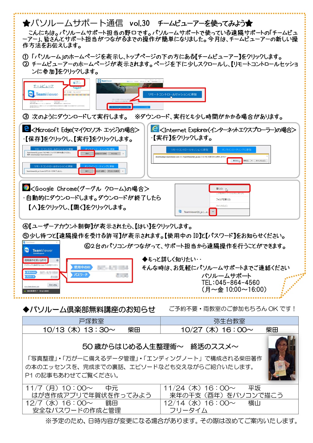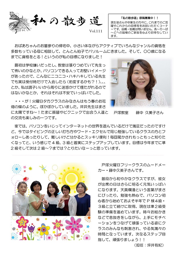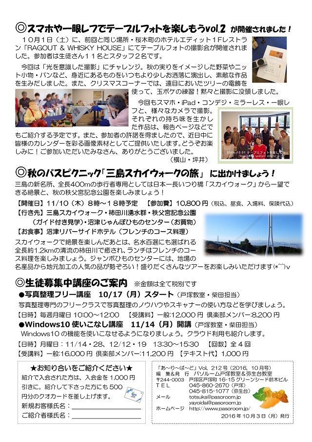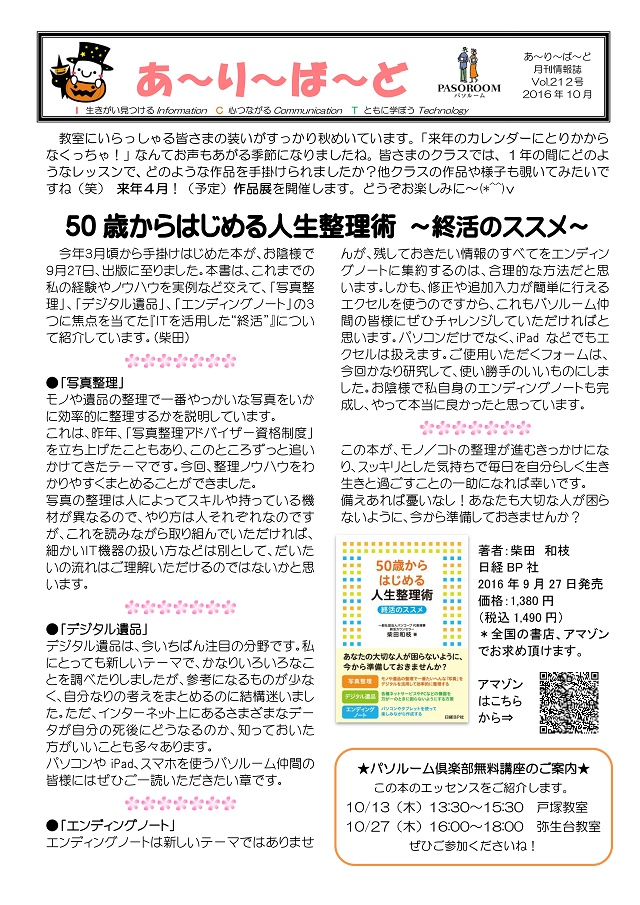 HOME > あ~り~ば~ど > あ~り~ば~ど 2016年10月号 Vol.212 あ~り~ば~ど 2016年10月号 Vol.212 今月の内容 **50歳からはじめる人生整理術 ~終活のススメ~** 私の散歩道 Vol.111 戸塚教室 藤中 久美子さん ★パソルームサポート通信 vol.30 チームビューアーを使ってみよう★パソルーム倶楽部無料講座のお知らせ スマホや一眼レフでテーブルフォトを楽しもうvol.2 が開催されました!秋のバスピクニック「三島スカイウォークの旅」 に出かけましょう!生徒募集中講座のご案内