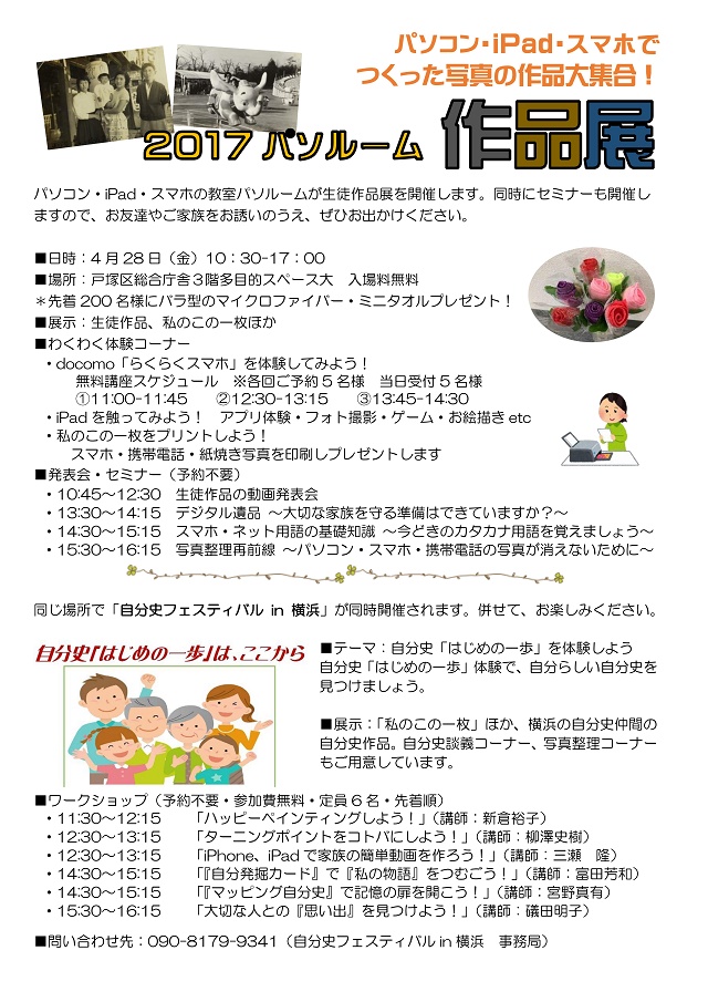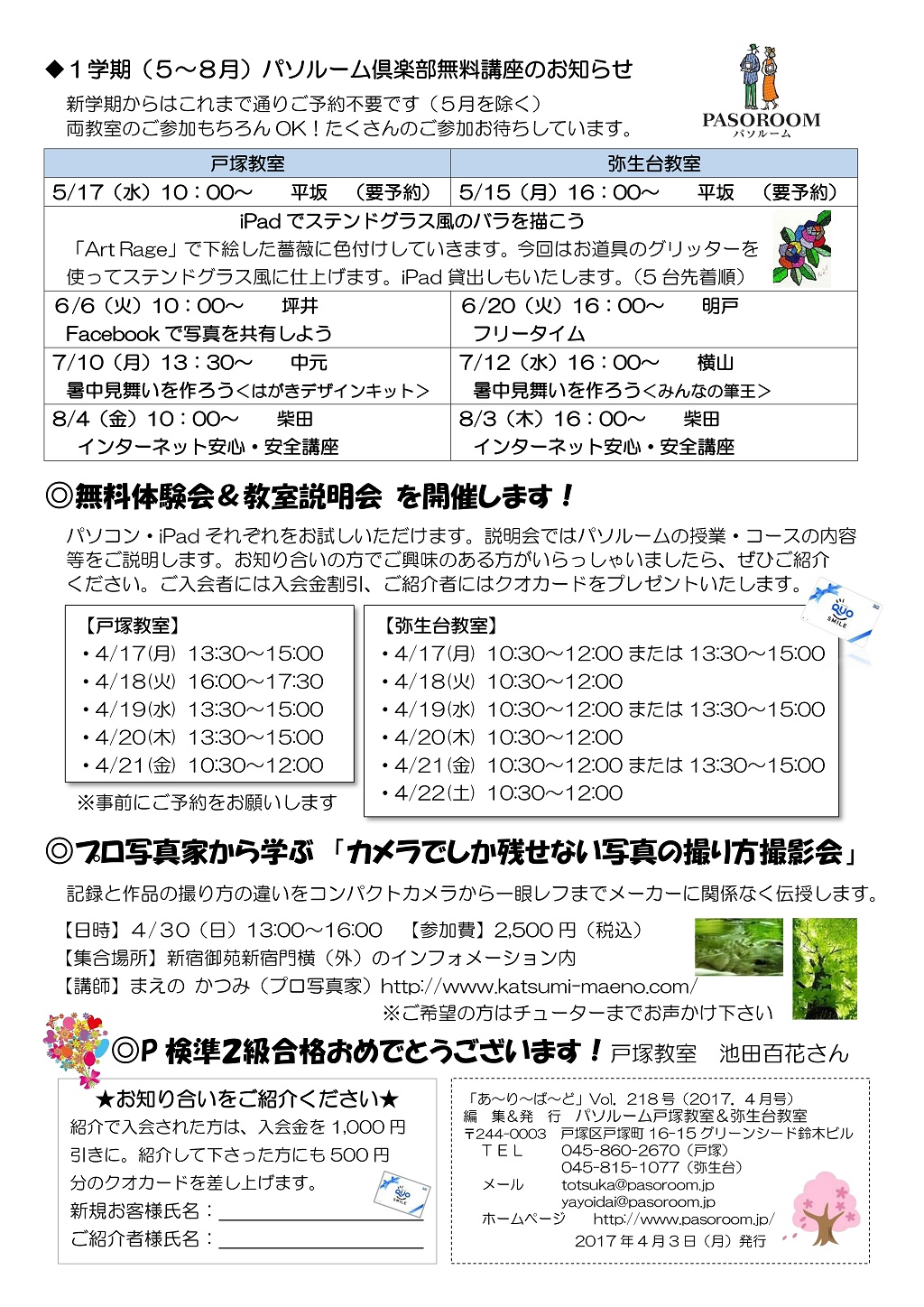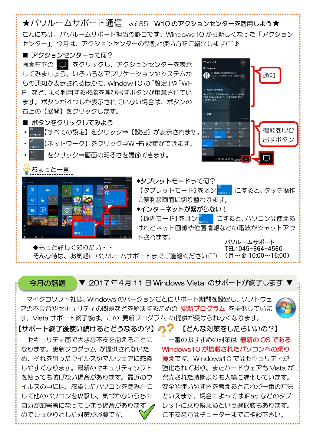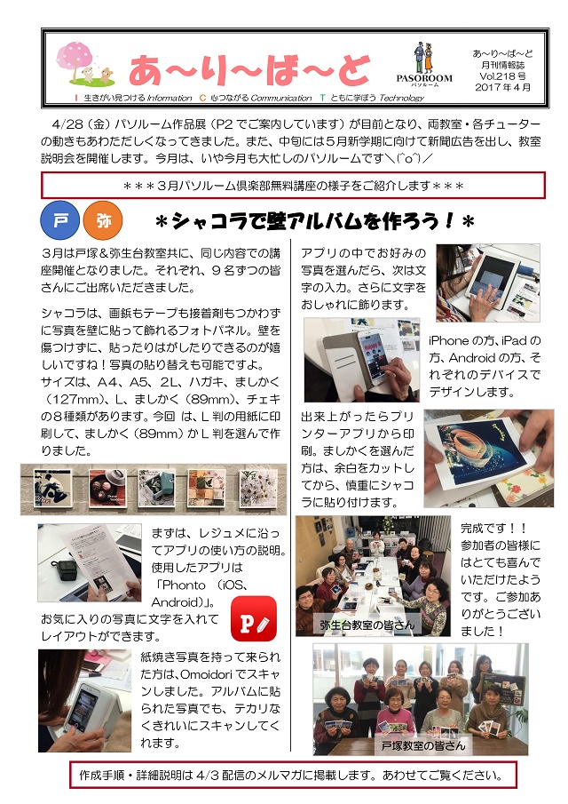 HOME > あ~り~ば~ど > あ~り~ば~ど 2017年4月号 Vol.218 あ~り~ば~ど 2017年4月号 Vol.218 今月の内容 **3月無料講座 シャコラで壁アルバムを作ろう!*** 2017 パソルーム作品展 ★パソルームサポート通信 vol.35 W10のアクションセンターを活用しよう★今月の話題 ▼2017年4月11日Windows Vista のサポートが終了します▼ 1学期(5~8月)パソルーム倶楽部無料講座のお知らせ無料体験会&教室説明会 を開催します!プロ写真家から学ぶ 「カメラでしか残せない写真の撮り方撮影会」P検準2級合格おめでとうございます!戸塚教室 池田百花さん