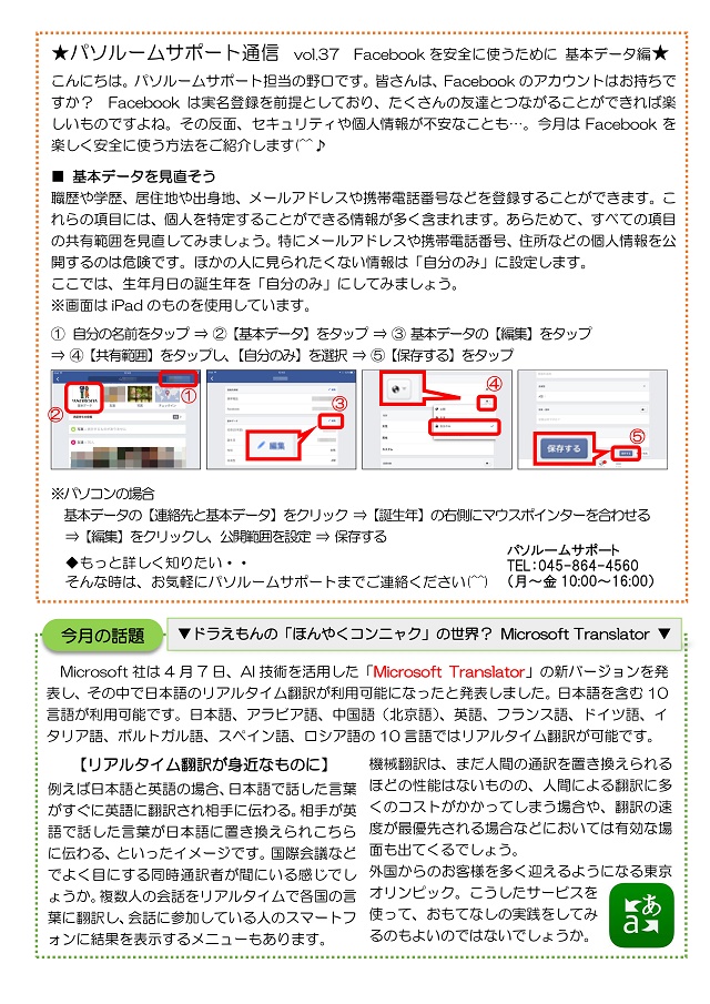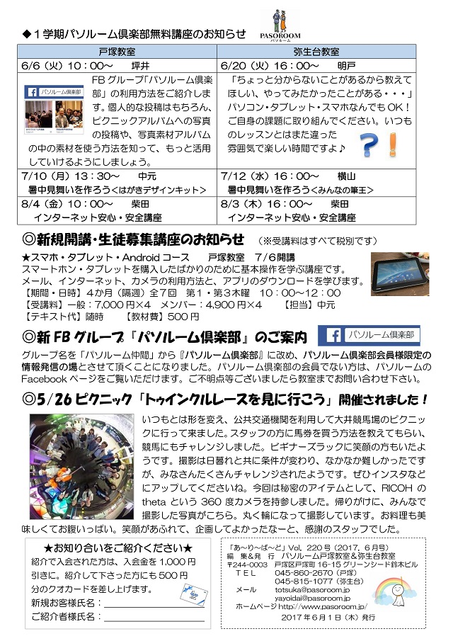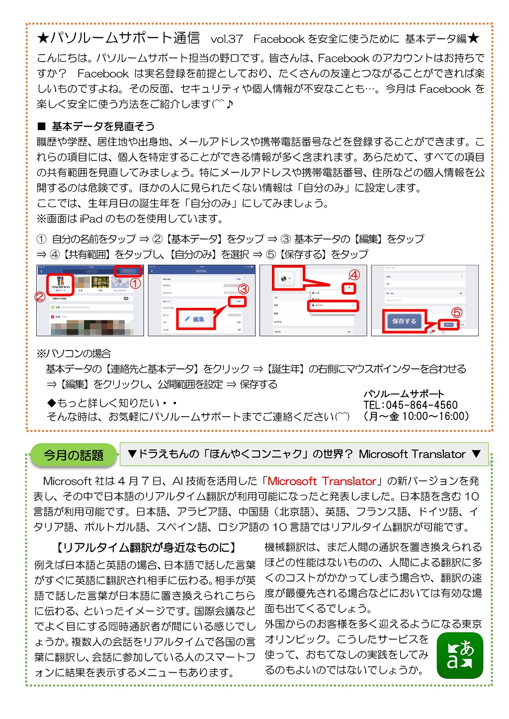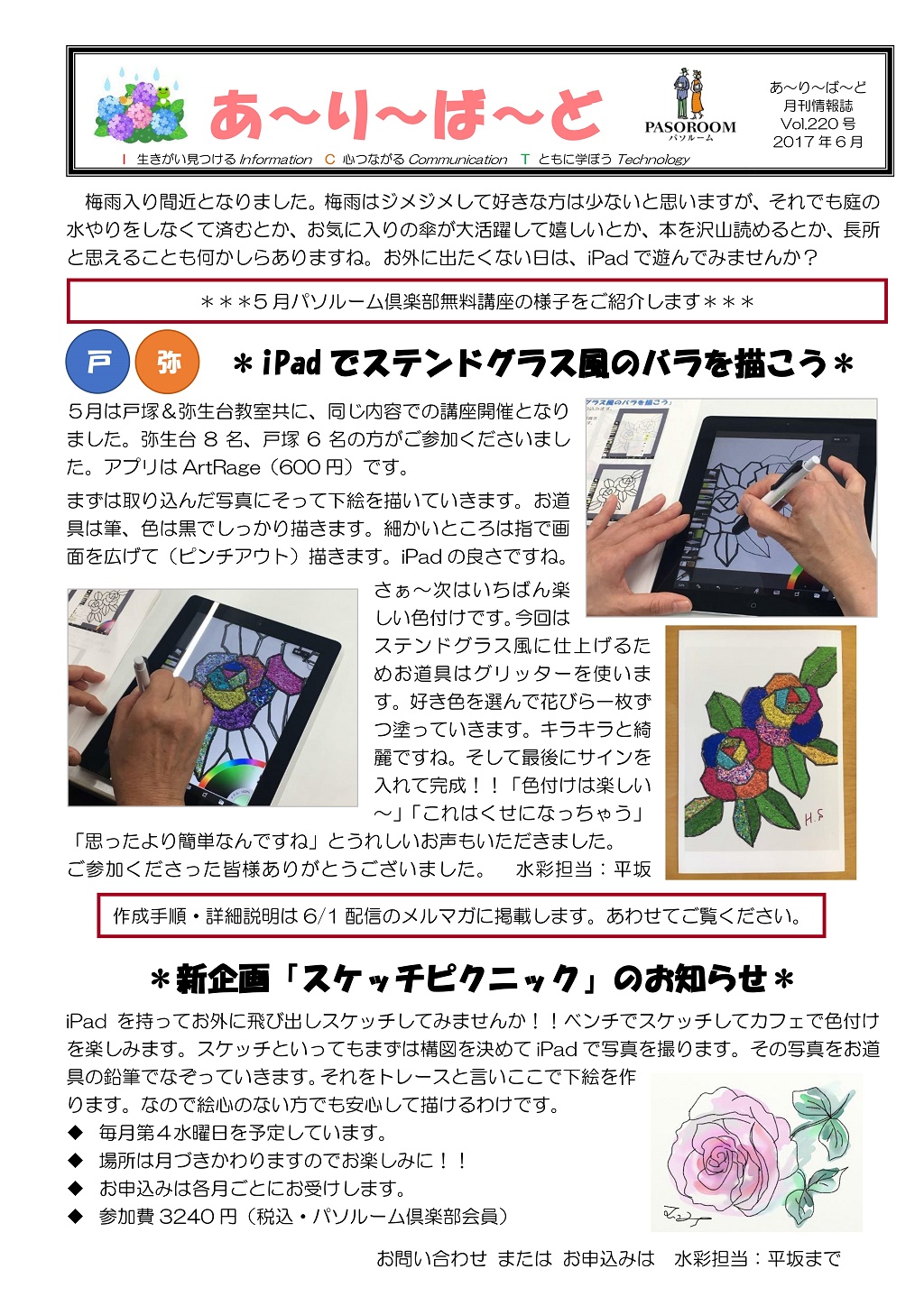 HOME > あ~り~ば~ど > あ~り~ば~ど 2017年6月号 Vol.220 あ~り~ば~ど 2017年6月号 Vol.220 今月の内容 *iPadでステンドグラス風のバラを描こう**新企画「スケッチピクニック」のお知らせ* 私の散歩道 戸塚教室 火曜午前クラスの皆様 ★パソルームサポート通信 vol.37 Facebookを安全に使うために 基本データ編★今月の話題 ▼ドラえもんの「ほんやくコンニャク」の世界? Microsoft Translator▼ 1学期パソルーム倶楽部無料講座のお知らせ新規開講・生徒募集講座のお知らせ新FBグループ 『パソルーム倶楽部』 のご案内5/26ピクニック 「トゥインクルレースを見に行こう」 開催されました!