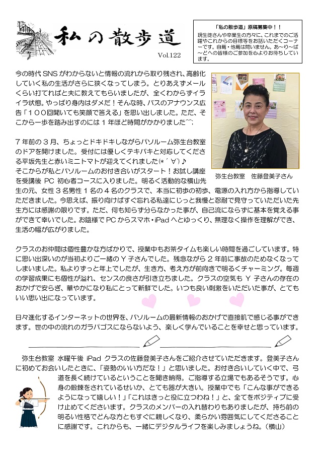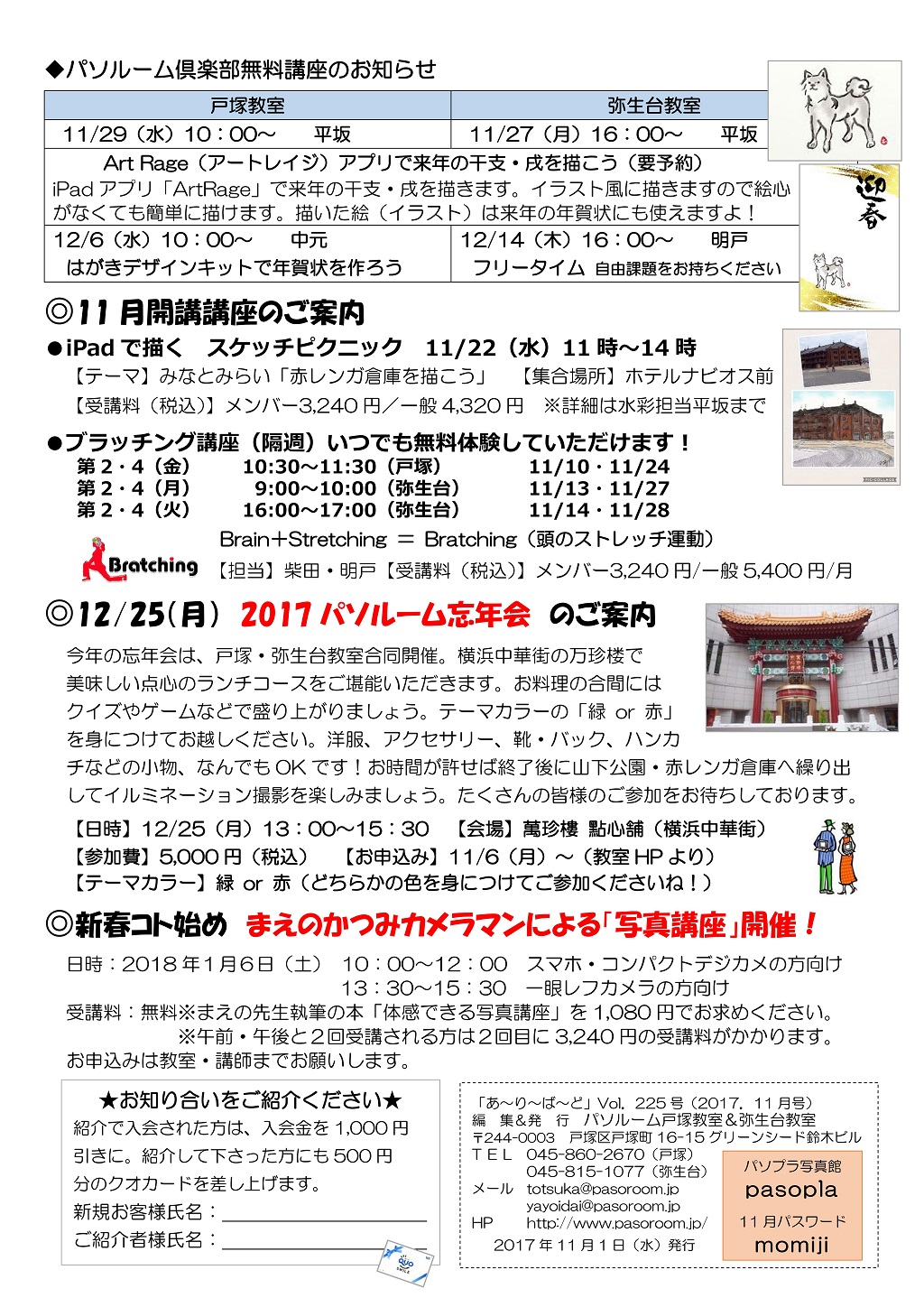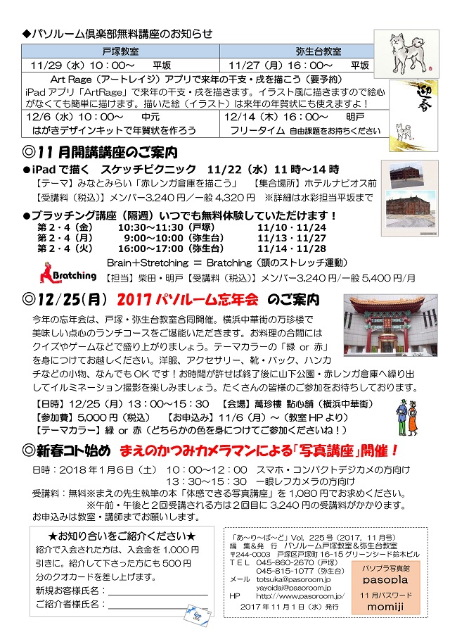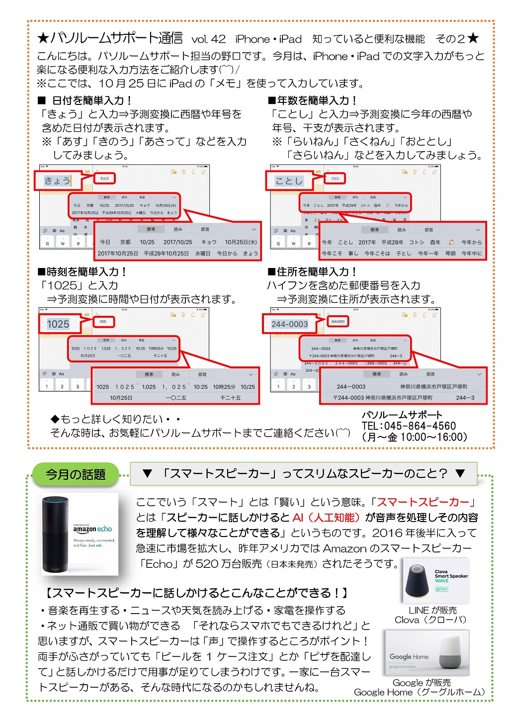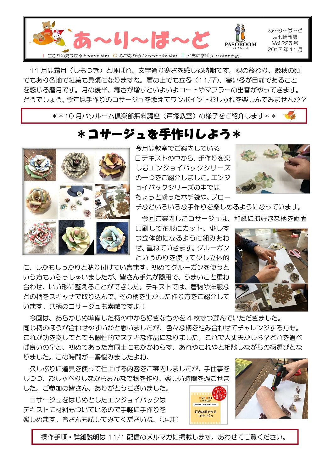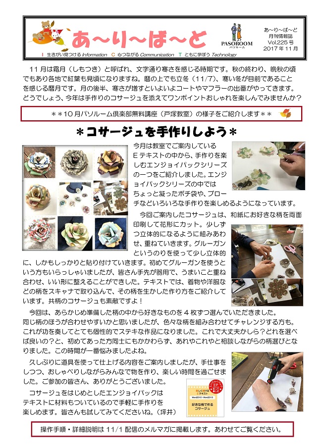 HOME > あ~り~ば~ど > あ~り~ば~ど 2017年11月号 Vol.225 あ~り~ば~ど 2017年11月号 Vol.225 今月の内容 10月無料講座 *コサージュを手作りしよう* 私の散歩道 弥生台教室 佐藤 登美子さん ★パソルームサポート通信 vol.42 iPhone・iPad 知っていると便利な機能 その2★今月の話題 ▼「スマートスピーカー」ってスリムなスピーカーのこと?▼ パソルーム倶楽部無料講座のお知らせ11月開講講座のご案内12/25(月) 2017パソルーム忘年会 のご案内新春コト始め まえのかつみカメラマンによる「写真講座」開催!