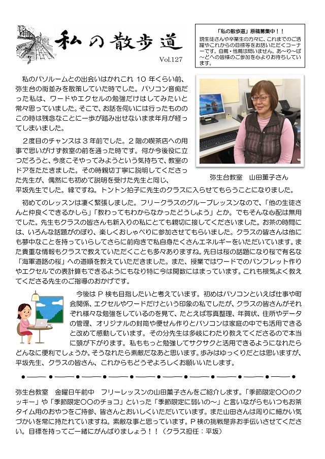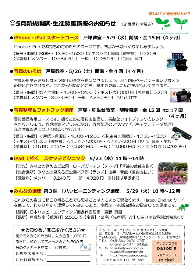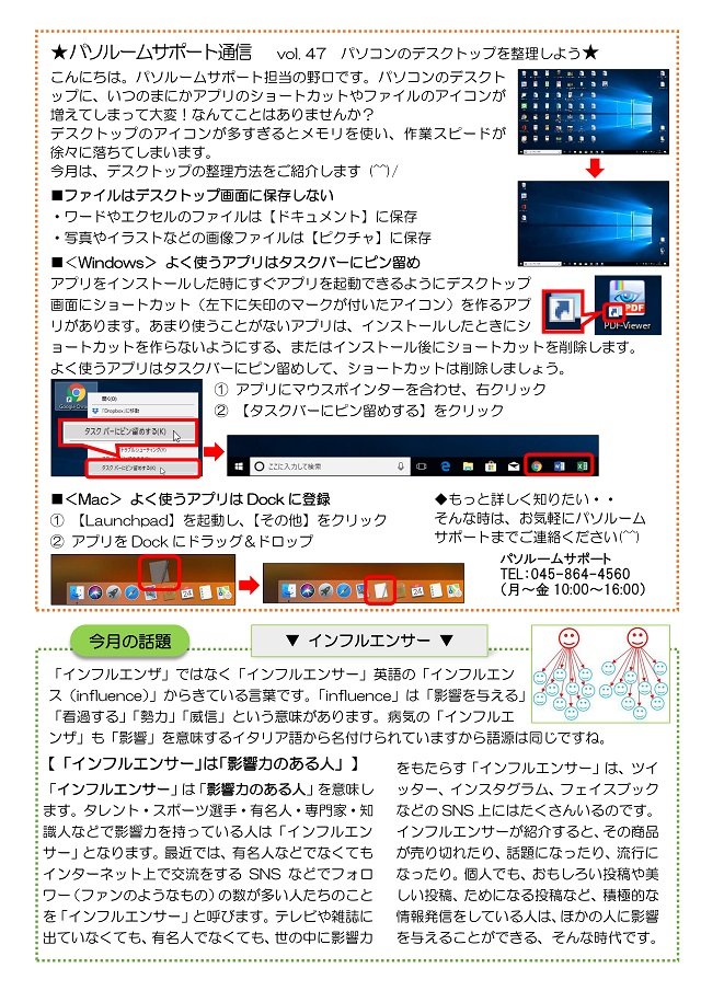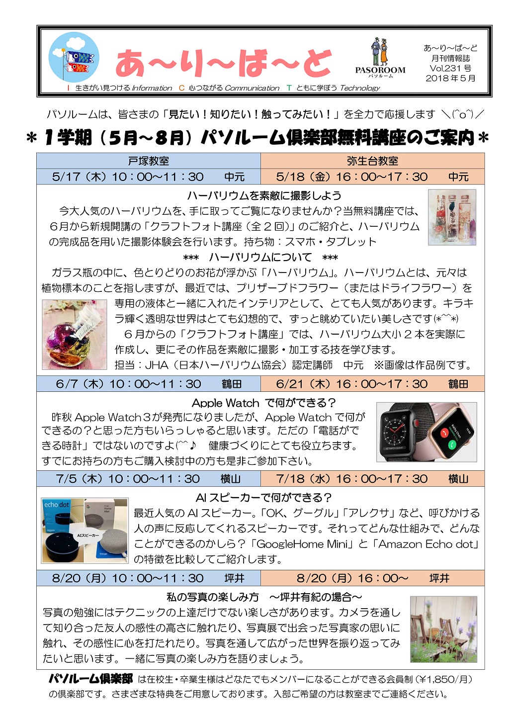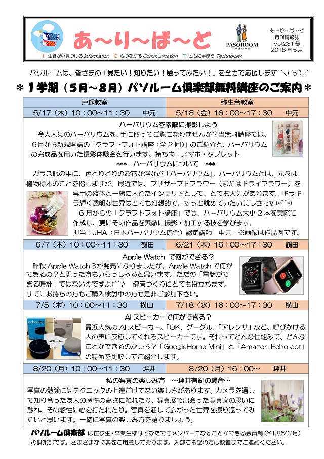 HOME > あ~り~ば~ど > あ~り~ば~ど 2018年5月号 Vol.231 あ~り~ば~ど 2018年5月号 Vol.231 今月の内容 *1学期(5月~8月)パソルーム倶楽部無料講座のご案内* 私の散歩道 弥生台教室 山田 薫子さん ★パソルームサポート通信 vol.47 パソコンのデスクトップを整理しよう★今月の話題 ▼インフルエンサー▼ 5月新規開講・生徒募集講座のお知らせ