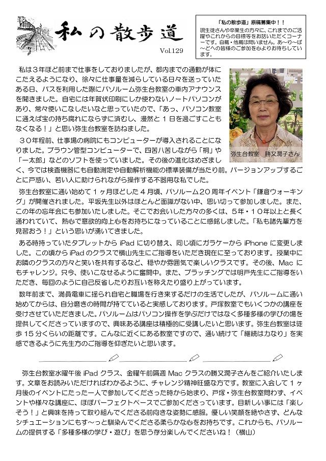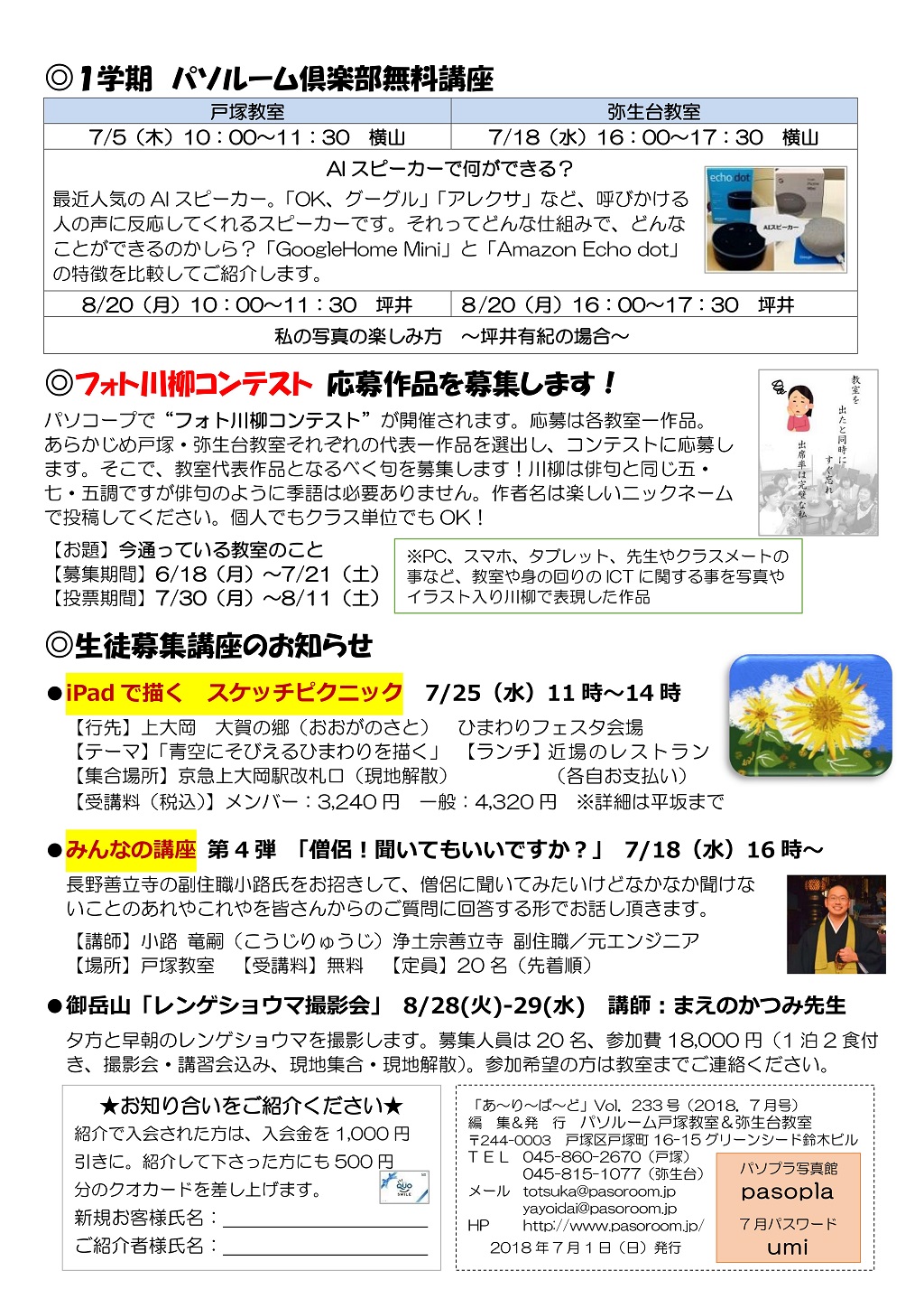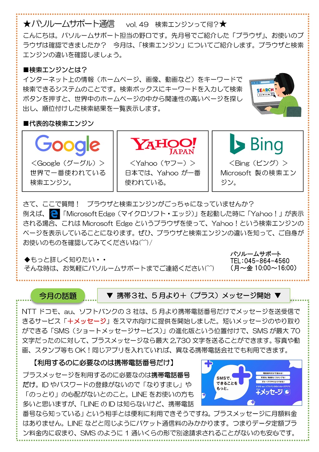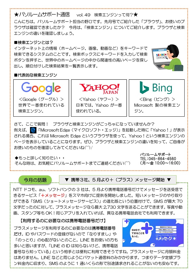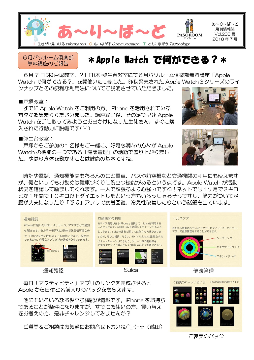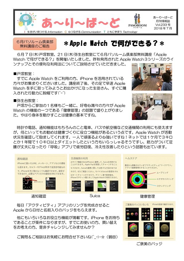 HOME > あ~り~ば~ど > あ~り~ば~ど 2018年7月号 Vol.233 あ~り~ば~ど 2018年7月号 Vol.233 今月の内容 *Apple Watch で何ができる?* 私の散歩道 弥生台教室 勝又 潤子さん ★パソルームサポート通信 vol.49 検索エンジンって何?★今月の話題 ▼携帯3社、5月より+(プラス)メッセージ開始▼ 1学期 パソルーム倶楽部無料講座フォト川柳コンテスト 応募作品を募集します!生徒募集講座のお知らせ