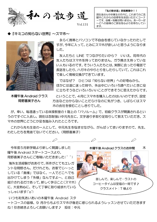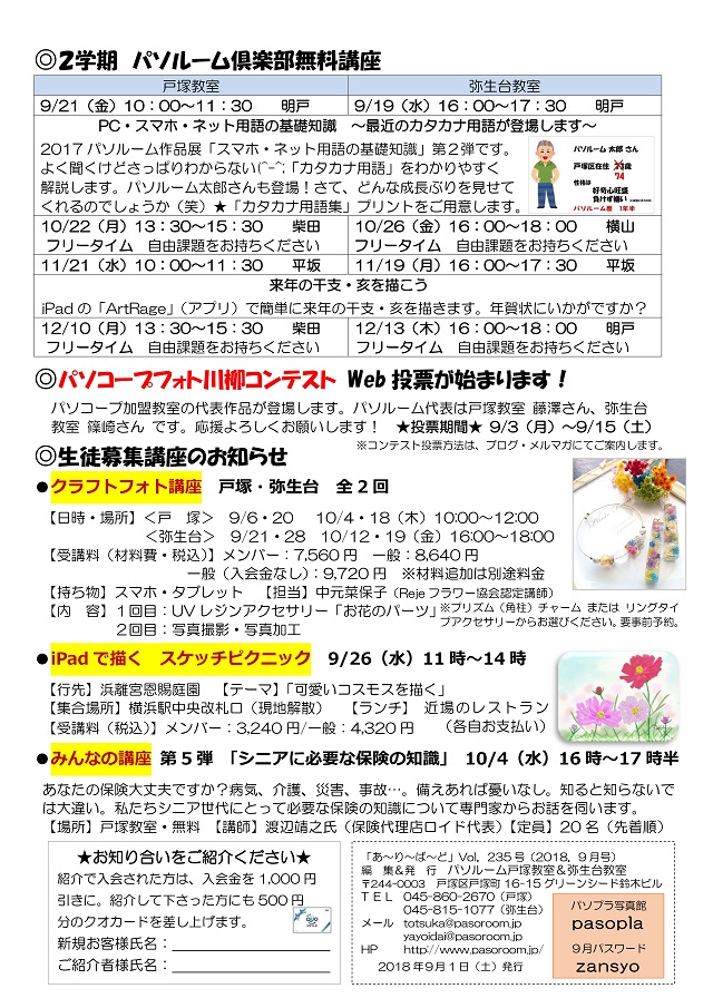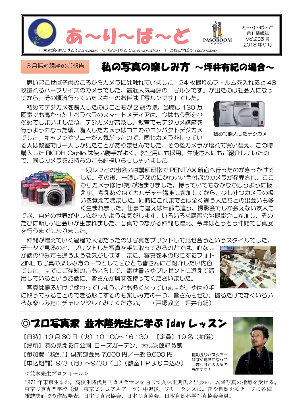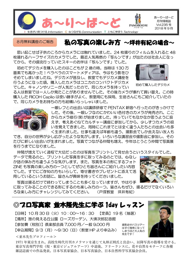 HOME > あ~り~ば~ど > あ~り~ば~ど 2018年9月号 Vol.235 あ~り~ば~ど 2018年9月号 Vol.235 今月の内容 *私の写真の楽しみ方 ~坪井有紀の場合~* プロ写真家 並木隆先生に学ぶ 1dayレッスン 私の散歩道 戸塚教室 岡野 喜美子さん ★パソルームサポート通信 vol.51 LINEの設定の変更方法を確認しよう!★ 今月の話題 ▼「おめでとうございます!スマホが当たります!」これって本当?▼ 2学期 パソルーム倶楽部無料講座 パソコープフォト川柳コンテスト Web投票が始まります! 生徒募集講座のお知らせ