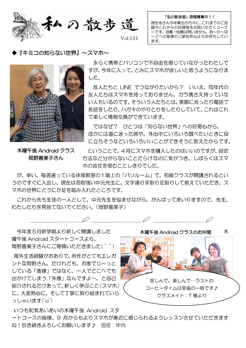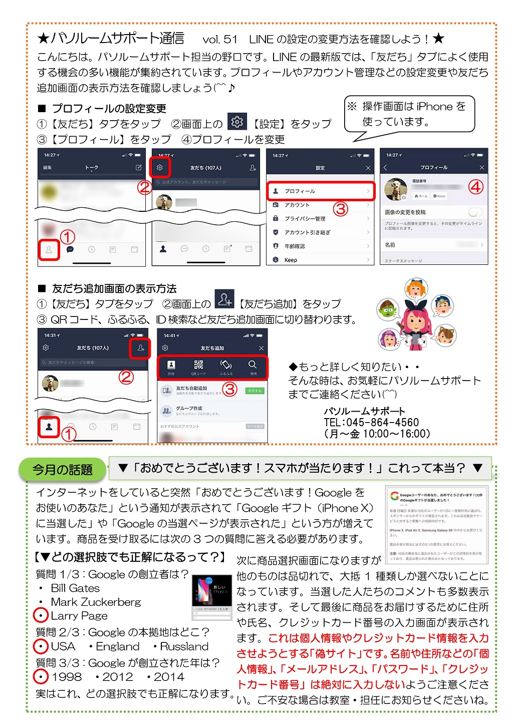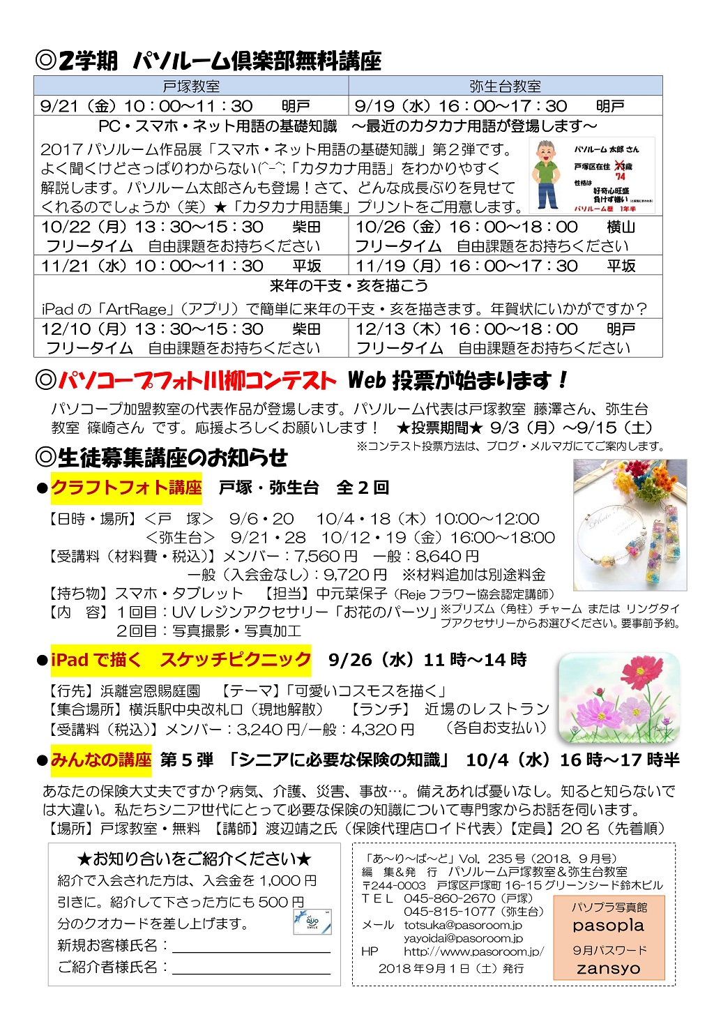 HOME > あ~り~ば~ど > あ~り~ば~ど 2018年9月号 Vol.235 あ~り~ば~ど 2018年9月号 Vol.235 今月の内容 *私の写真の楽しみ方 ~坪井有紀の場合~* プロ写真家 並木隆先生に学ぶ 1dayレッスン 私の散歩道 戸塚教室 岡野 喜美子さん ★パソルームサポート通信 vol.51 LINEの設定の変更方法を確認しよう!★ 今月の話題 ▼「おめでとうございます!スマホが当たります!」これって本当?▼ 2学期 パソルーム倶楽部無料講座 パソコープフォト川柳コンテスト Web投票が始まります! 生徒募集講座のお知らせ