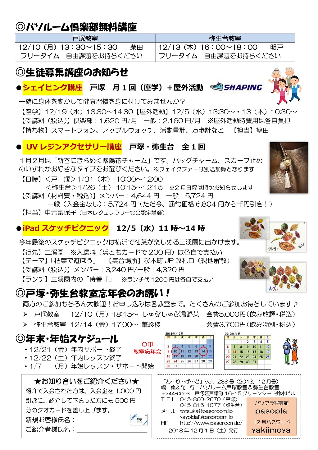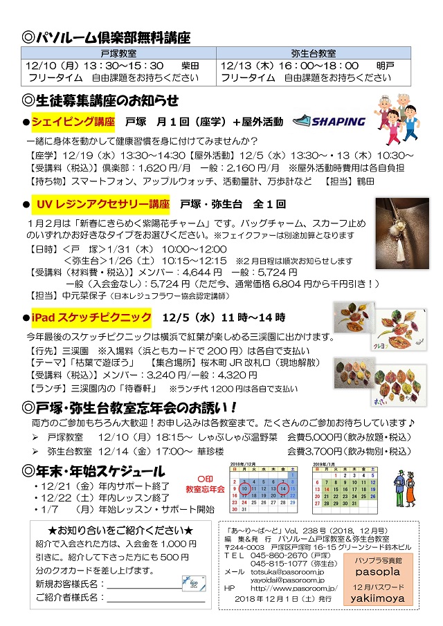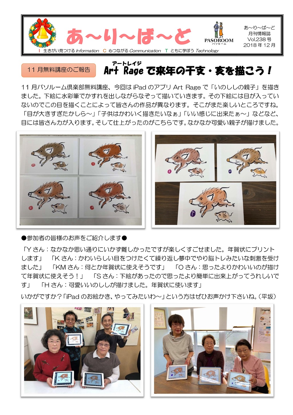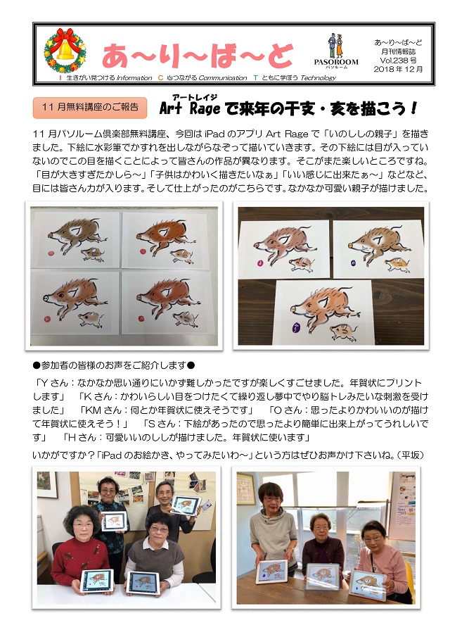 HOME > あ~り~ば~ど > あ~り~ば~ど 2018年12月号 Vol.238 あ~り~ば~ど 2018年12月号 Vol.238 今月の内容 Art Rageで来年の干支・亥を描こう! 私の散歩道 スケッチピクニックのお仲間 ★パソルームサポート通信 vol.54 iPhoneの「ヘルスケア」アプリを使ってみよう★ 今月の話題 ▼「ギガが減る」ってどういう意味ですか?▼ パソルーム倶楽部無料講座 生徒募集講座のお知らせ 戸塚・弥生台教室忘年会のお誘い! 年末・年始スケジュール