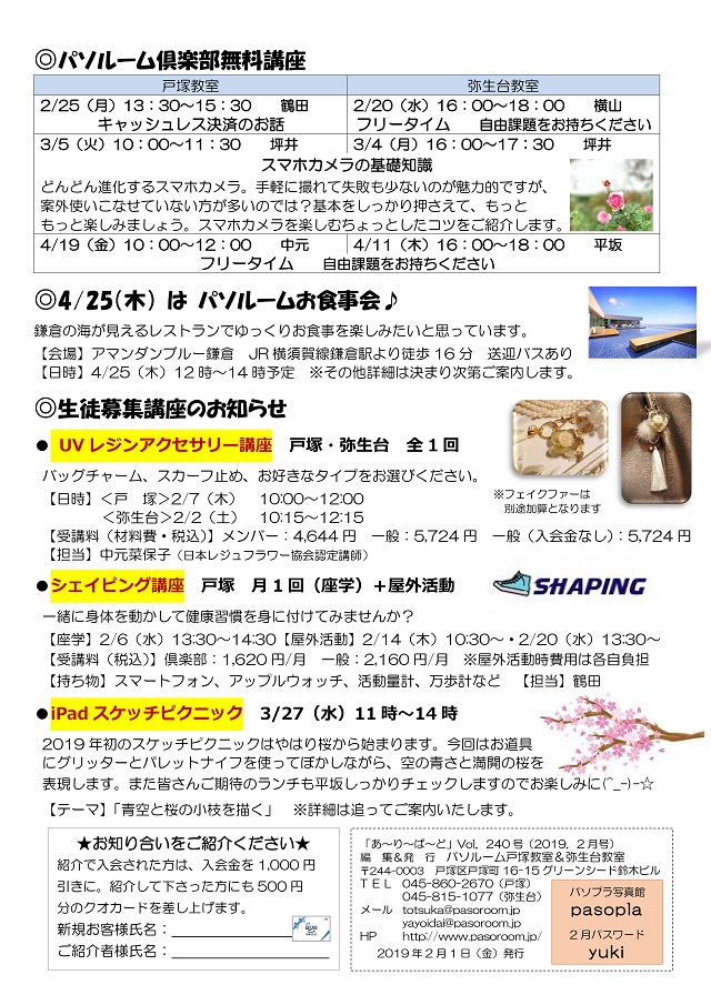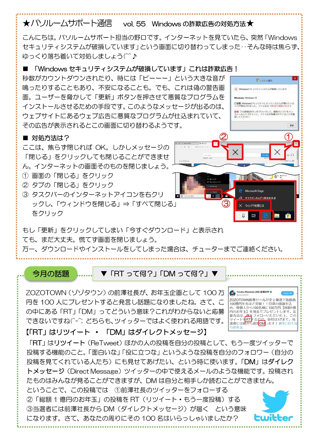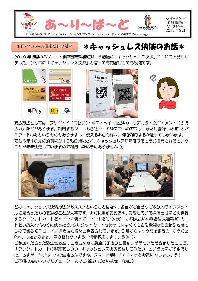 HOME > あ~り~ば~ど > あ~り~ば~ど 2019年2月号 Vol.240 あ~り~ば~ど 2019年2月号 Vol.240 今月の内容 *キャッシュレス決済のお話* キャッシュレスとは?知っておきたいキャッシュレス決済の基礎知識 ★パソルームサポート通信 vol.55 Windowsの詐欺広告の対処方法★ 今月の話題 ▼「RTって何?」「DMって何?」▼ パソルーム倶楽部無料講座 4/25(木) は パソルームお食事会♪ 生徒募集講座のご案内