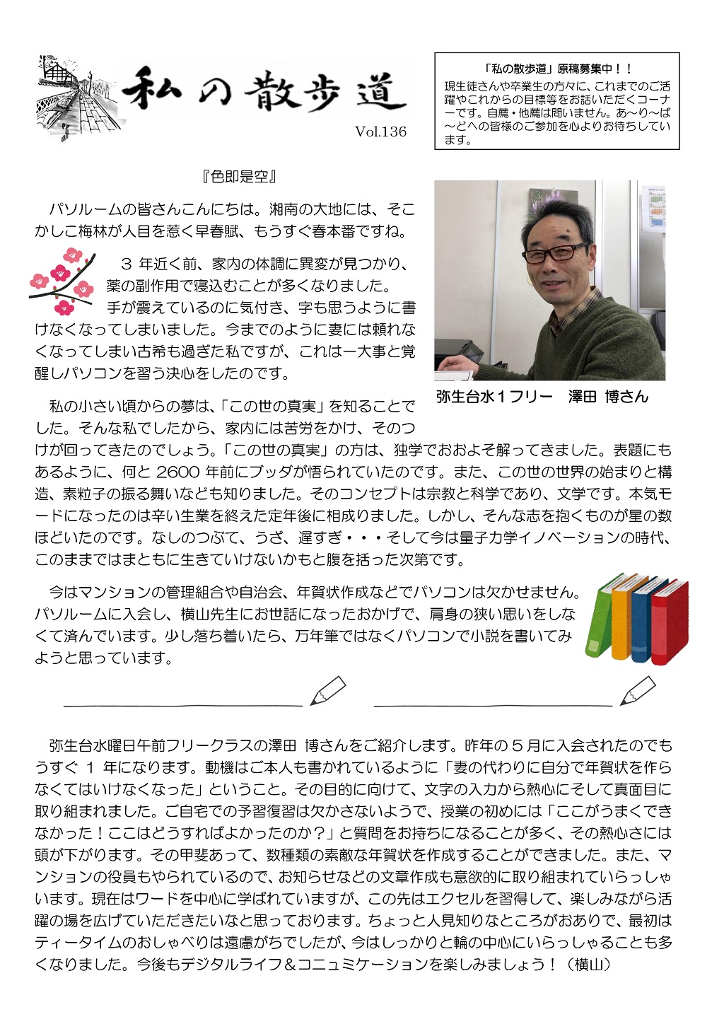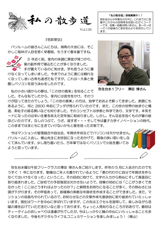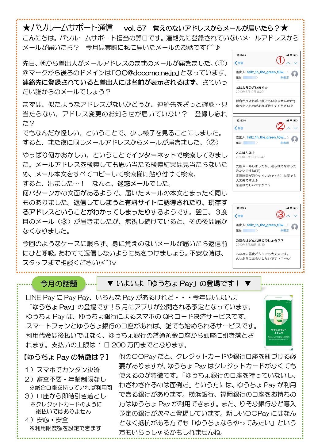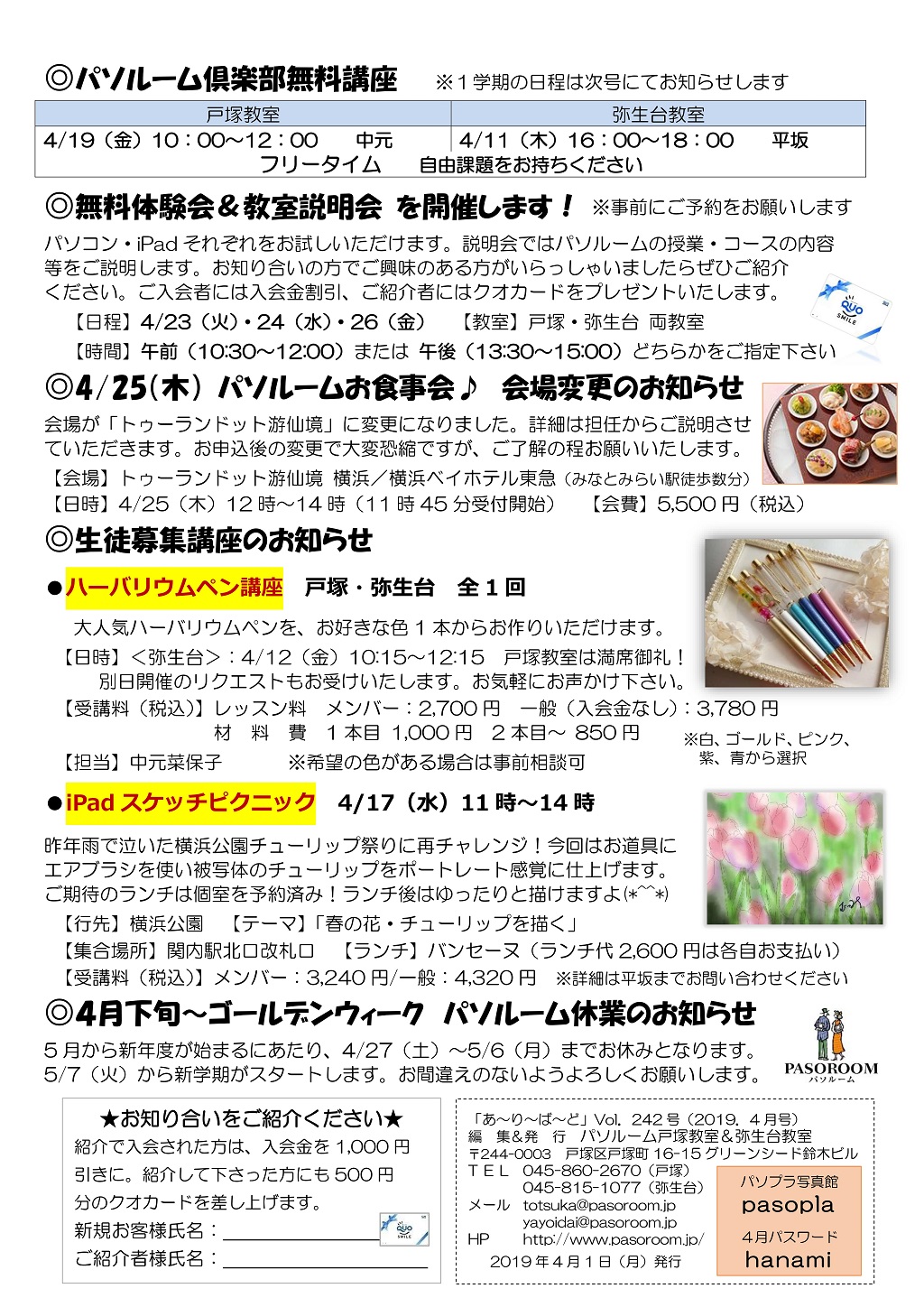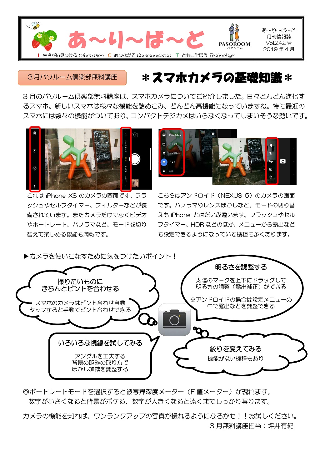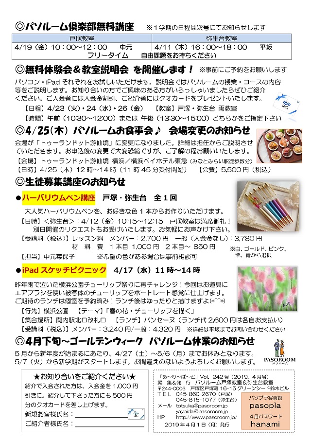 HOME > あ~り~ば~ど > あ~り~ば~ど 2019年4月号 Vol.242 あ~り~ば~ど 2019年4月号 Vol.242 今月の内容 *スマホカメラの基礎知識* 私の散歩道 弥生台教室 澤田 博さん ★パソルームサポート通信 vol.57 覚えのないアドレスからメールが届いたら?★ 今月の話題 ▼ いよいよ「ゆうちょPay」の登場です!▼ パソルーム倶楽部無料講座 無料体験会&教室説明会を開催します! 4/25(木)パソルームお食事会♪ 会場変更のお知らせ 生徒募集講座のご案内