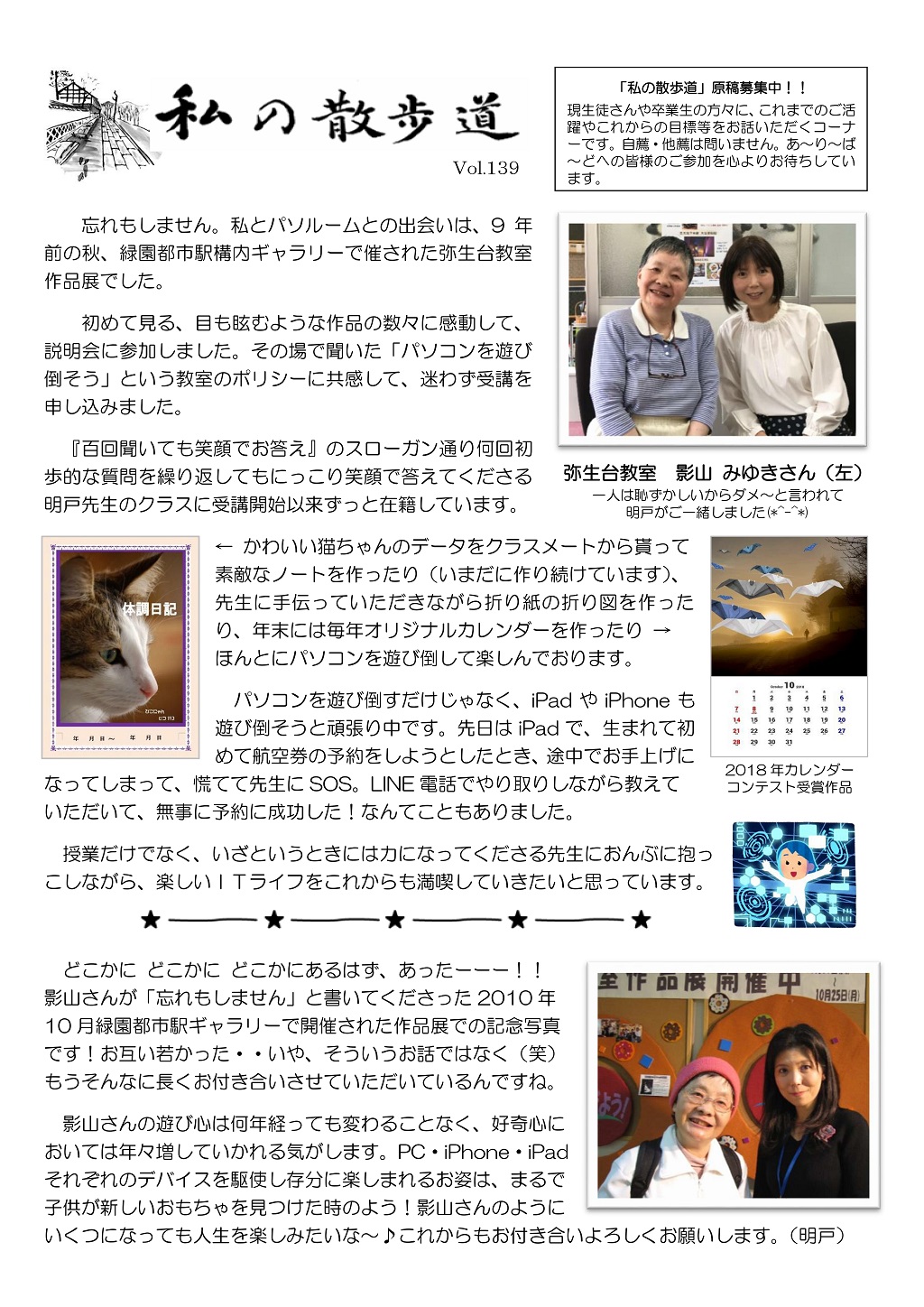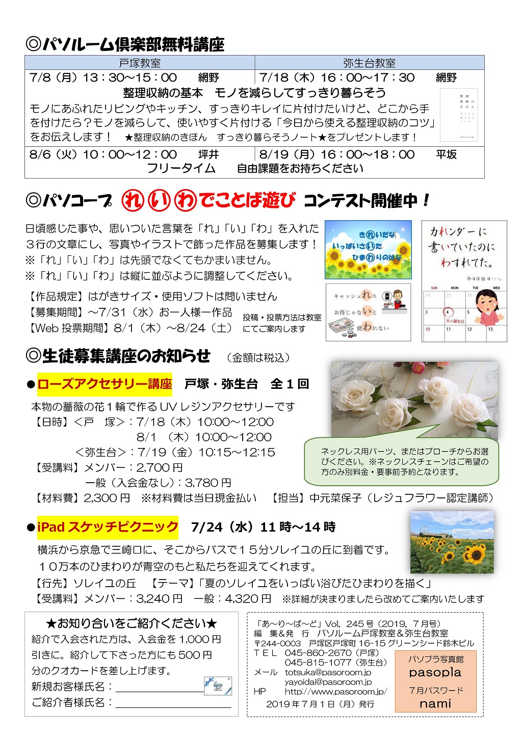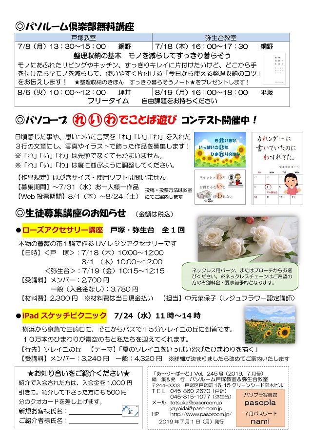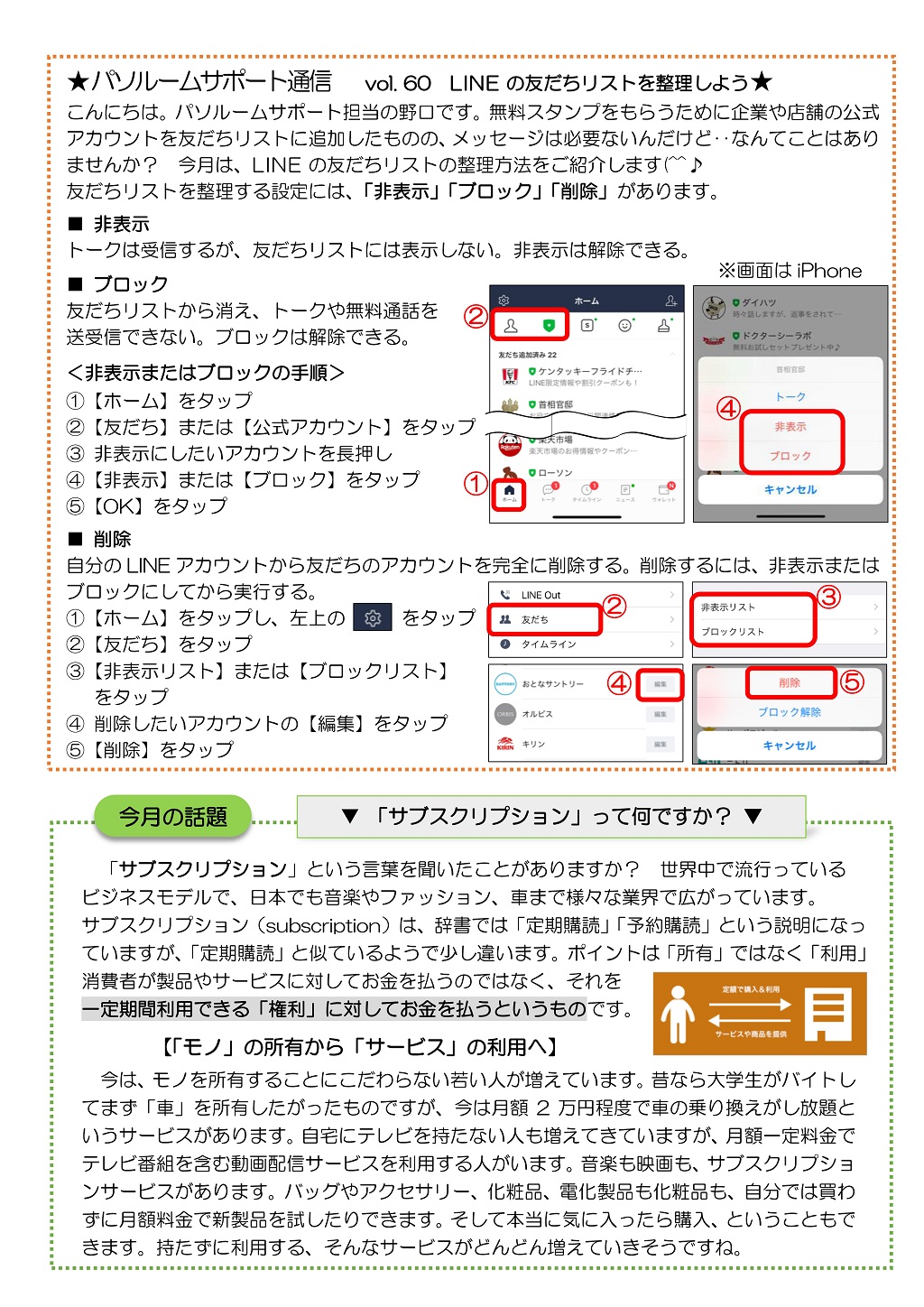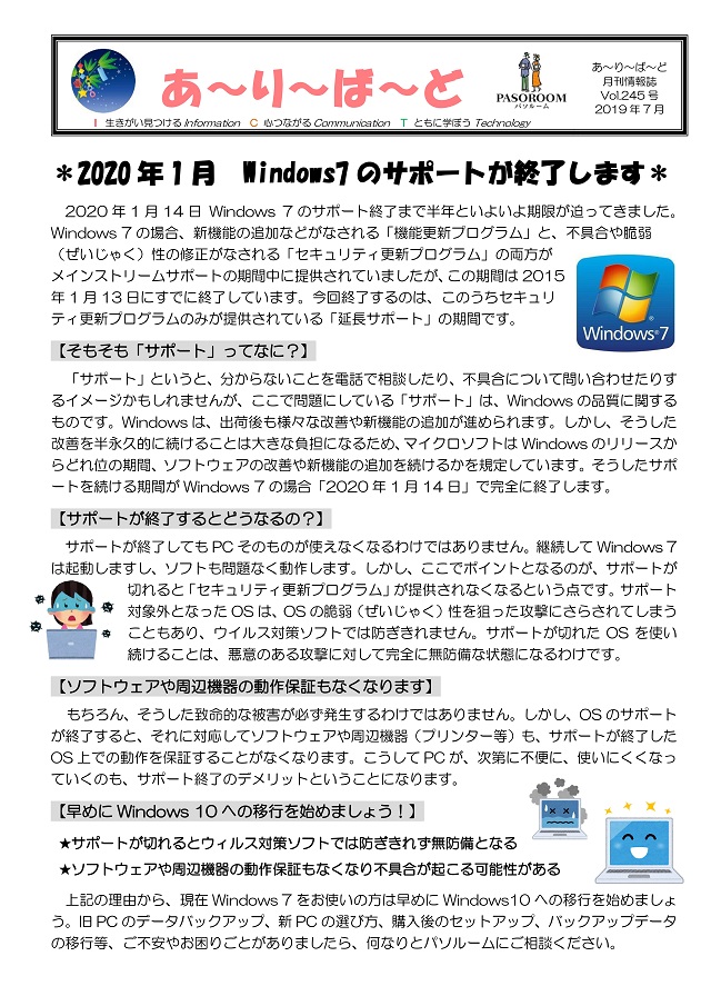 HOME > あ~り~ば~ど > あ~り~ば~ど 2019年7月号 Vol.245 あ~り~ば~ど 2019年7月号 Vol.245 今月の内容 *2020年1月 Windows7のサポートが終了します* 私の散歩道 弥生台教室 影山 みゆき さん ★パソルームサポート通信 vol.60 LINEの友だちリストを整理しよう★ 今月の話題 ▼ 「サブスクリプション」って何ですか? ▼ パソルーム倶楽部無料講座 パソコープ 「れ・い・わ」でことば遊び コンテスト開催中! 生徒募集講座のお知らせ