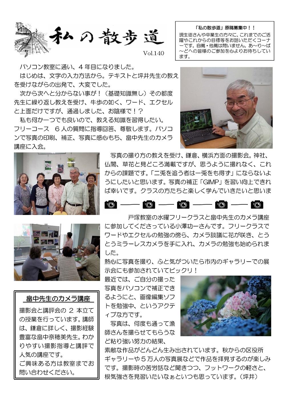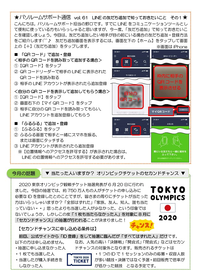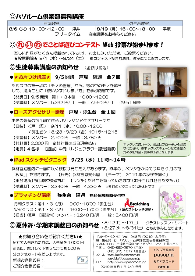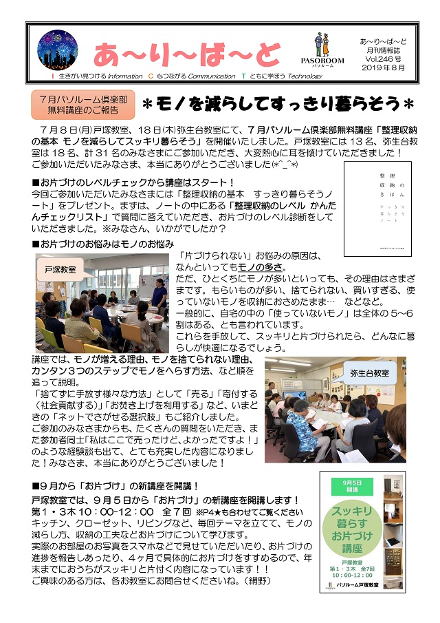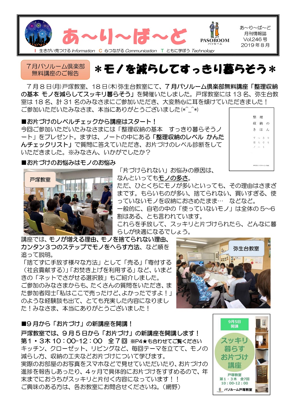 HOME > あ~り~ば~ど > あ~り~ば~ど 2019年8月号 Vol.246 あ~り~ば~ど 2019年8月号 Vol.246 今月の内容 *7月無料講座 モノを減らしてすっきり暮らそう* 私の散歩道 戸塚教室 小澤 功一 さん ★パソルームサポート通信 vol.61 LINEの友だち追加で知っておきたいこと その1★ 今月の話題 ▼ 当たった人いますか? オリンピックチケットのセカンドチャンス ▼ パソルーム倶楽部無料講座 パソコープ 「れ・い・わ」でことば遊びコンテストWeb投票が始まります! 生徒募集講座のお知らせ 夏休み・学期末調整日のお知らせ