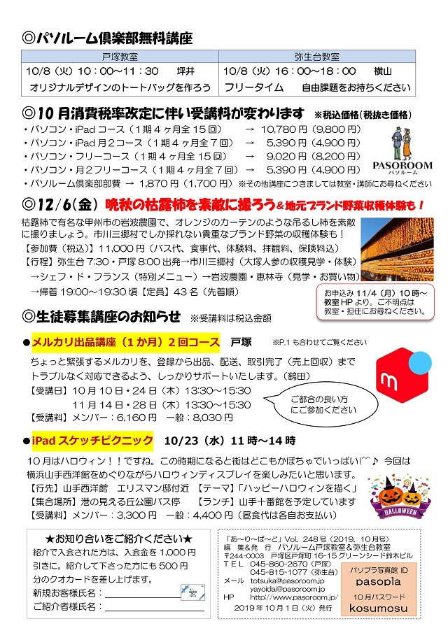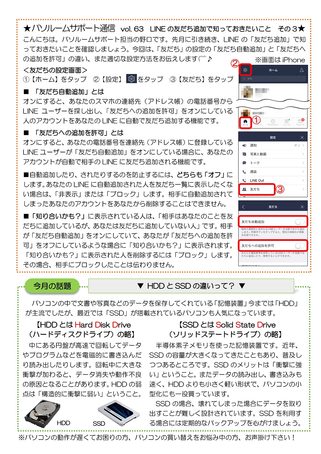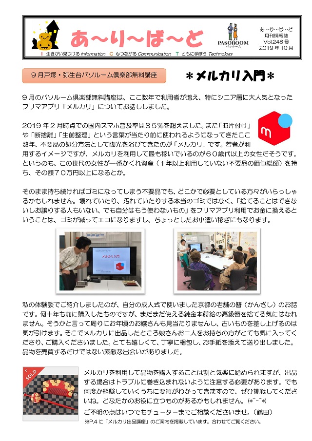 HOME > あ~り~ば~ど > あ~り~ば~ど 2019年10月号 Vol.248 あ~り~ば~ど 2019年10月号 Vol.248 今月の内容 9月戸塚・弥生台パソルーム倶楽部無料講座*メルカリ入門* 私の散歩道 戸塚教室 金曜日iPad活用クラス 佐野 光子さん ★パソルームサポート通信 vol.63 LINEの友だち追加で知っておきたいこと その3★ 今月の話題 ▼ HDDとSSDの違いって? ▼ パソルーム倶楽部無料講座 10月消費税率改定に伴い受講料が変わります 12/6(金) 晩秋の枯露柿を素敵に撮ろう&地元ブランド野菜収穫体験も! 生徒募集講座のお知らせ