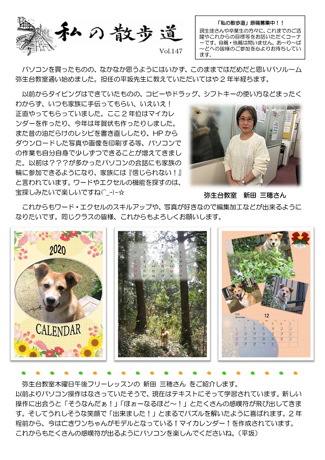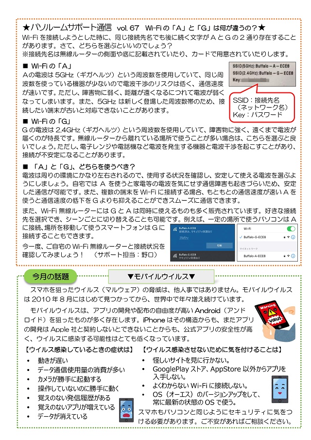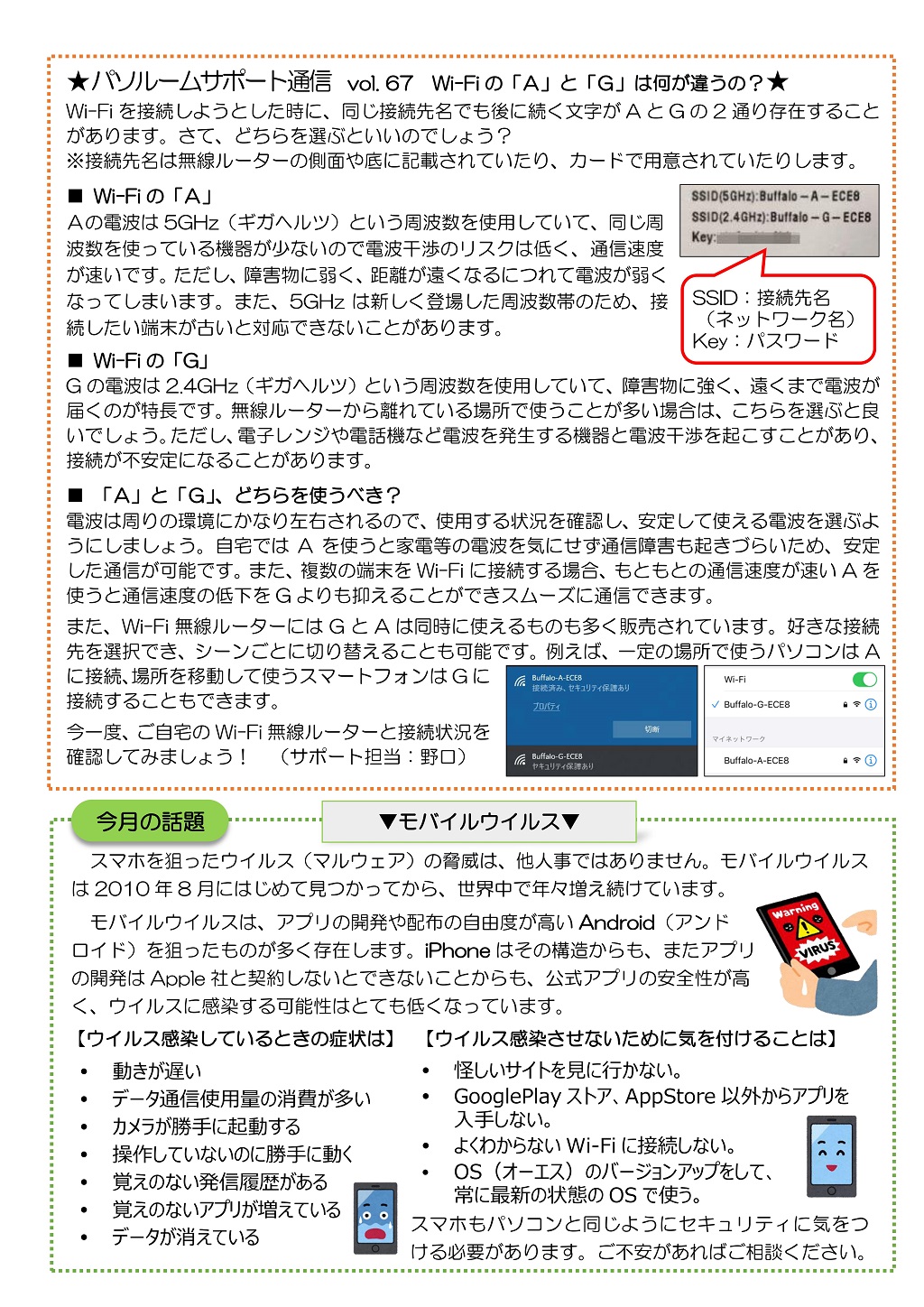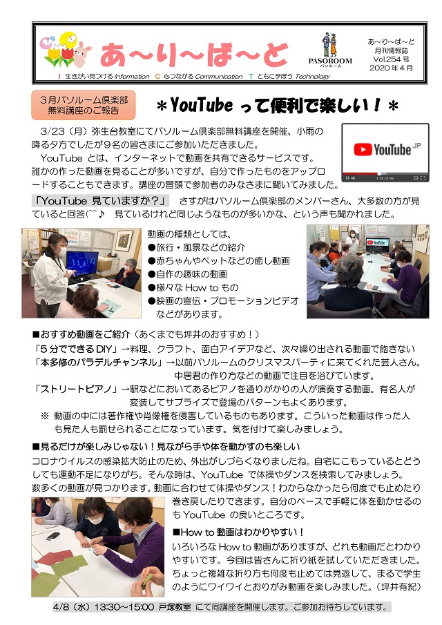 HOME > あ~り~ば~ど > あ~り~ば~ど 2020年4月号 Vol.254 あ~り~ば~ど 2020年4月号 Vol.254 今月の内容 3月パソルーム倶楽部無料講座 *YouTubeって便利で楽しい!* 私の散歩道 弥生台教室 新田 三穂さん ★パソルームサポート通信 vol. 67 Wi-Fiの「A」と「G」は何が違うの?★ 今月の話題 ▼モバイルウイルス▼ パソルーム倶楽部無料講座 Zoom(ズーム) オンラインでレッスンが受講できます! 生徒募集講座のお知らせ バスピクニック 開催中止のお知らせ 4月下旬~ゴールデンウィーク パソルーム新学期前のお休み ★LINEでPASOROOMとお友達になろう!★