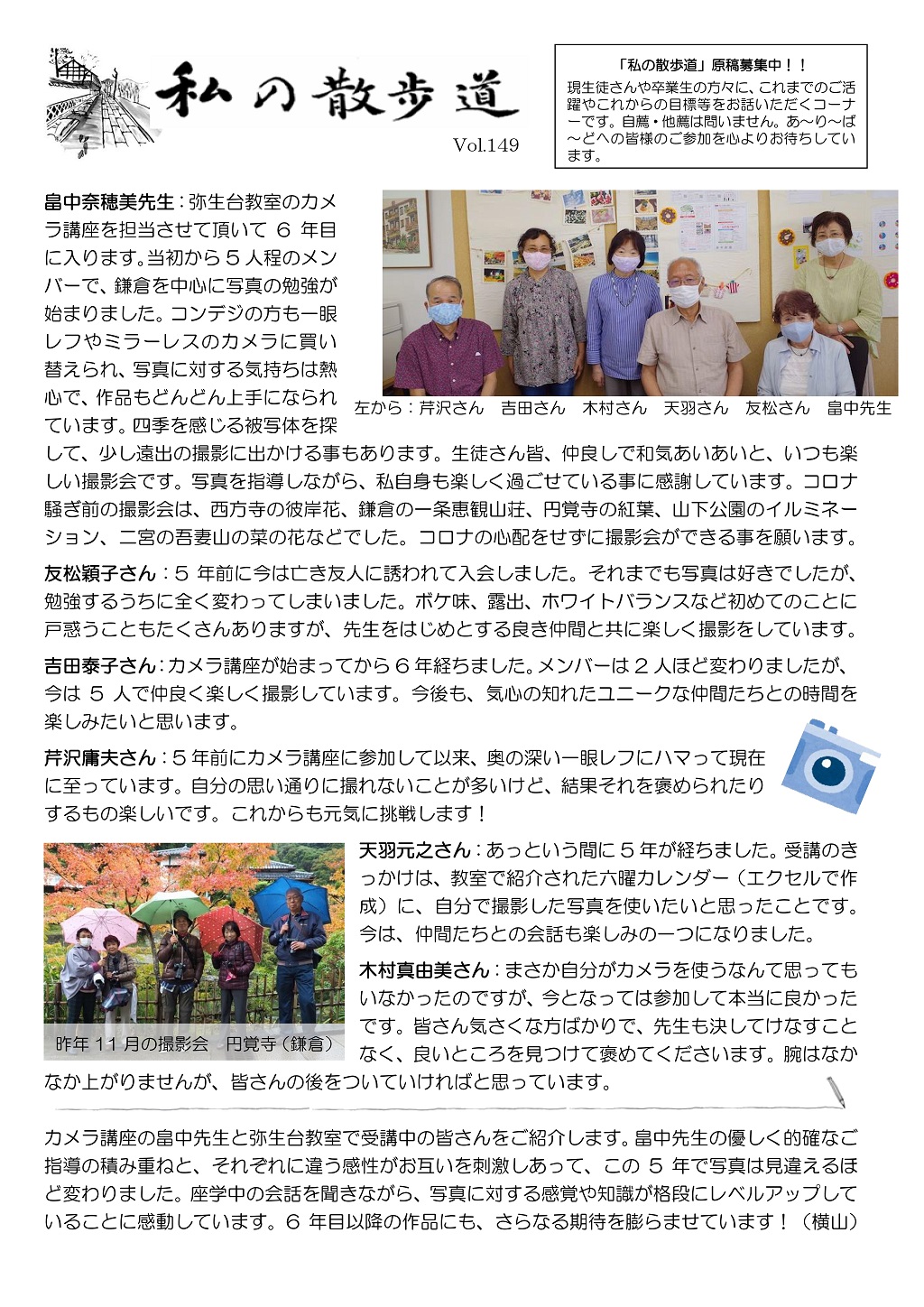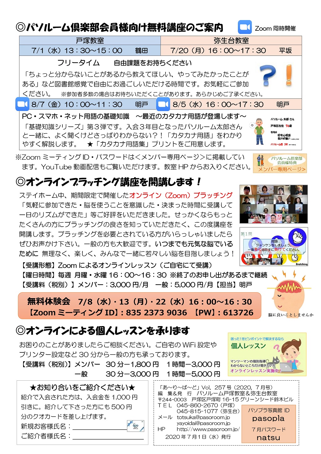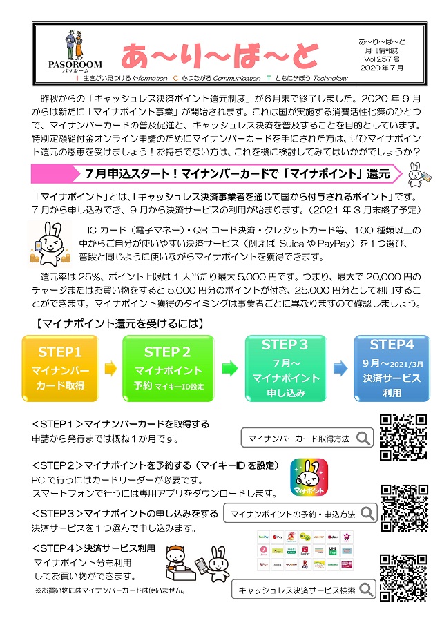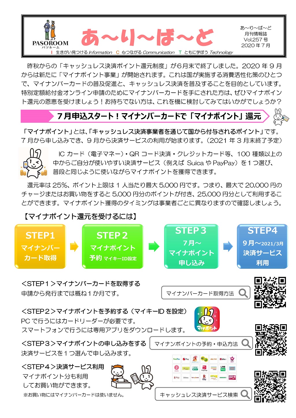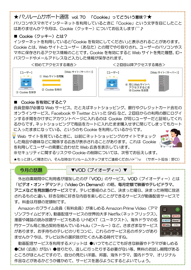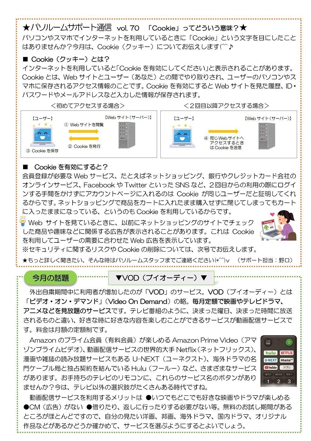 HOME > あ~り~ば~ど > あ~り~ば~ど 2020年7月号 Vol.257 あ~り~ば~ど 2020年7月号 Vol.257 今月の内容 7月申込スタート!マイナンバーカードで 「マイナポイント」 還元 私の散歩道 Vol.149 弥生台教室 カメラ講座 畠中先生とクラスの皆さん ★パソルームサポート通信 vol.70 「Cookie」ってどういう意味?★ 今月の話題 ▼VOD(ブイオーディー)▼ パソルーム倶楽部会員様向け無料講座のご案内 オンラインブラッチング講座を開講します! オンラインによる個人レッスンを承ります