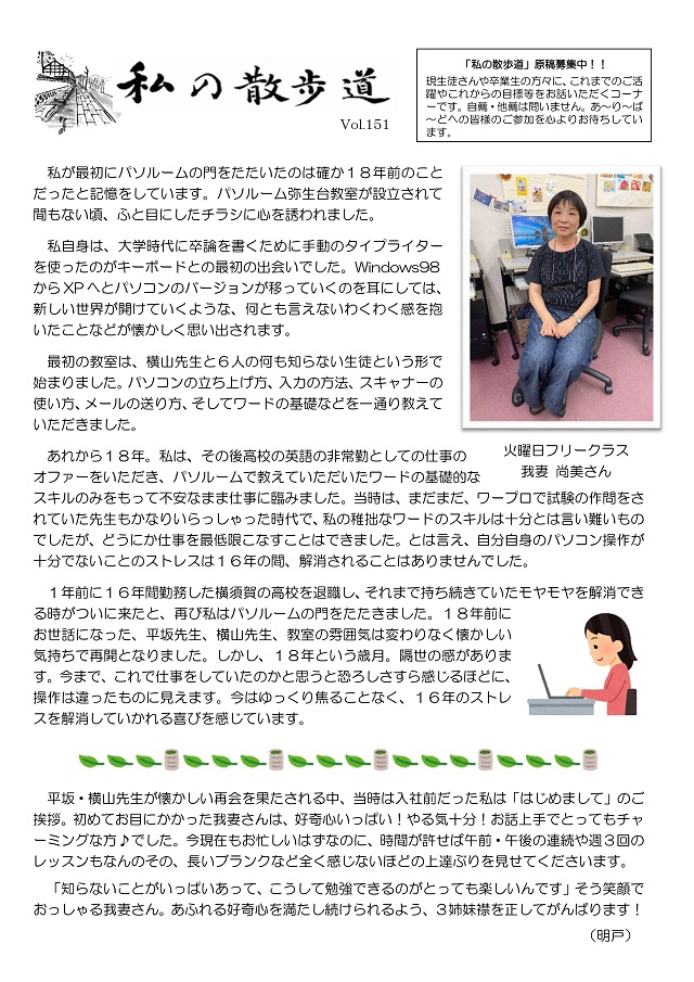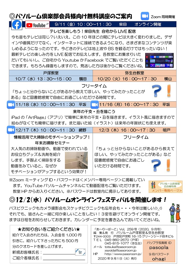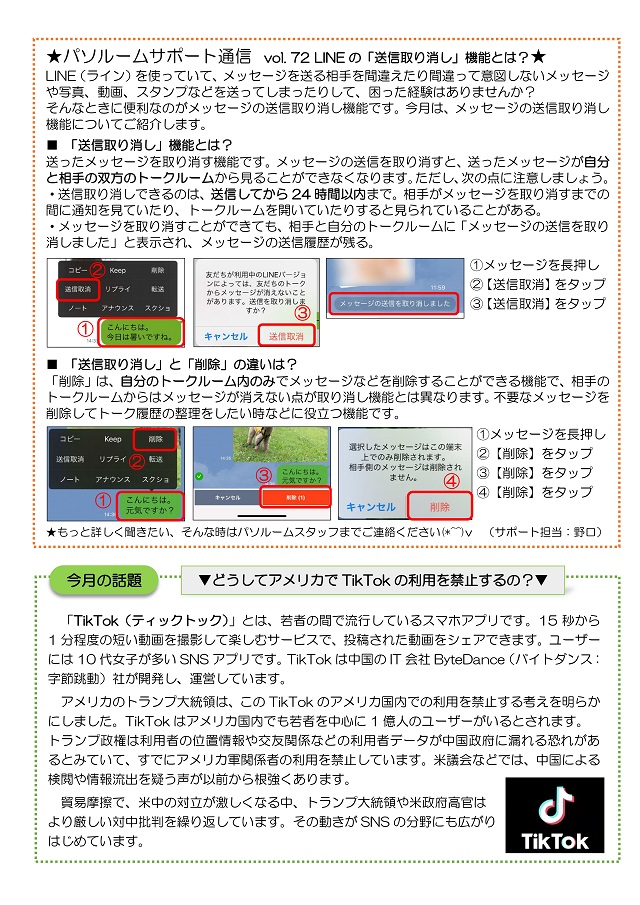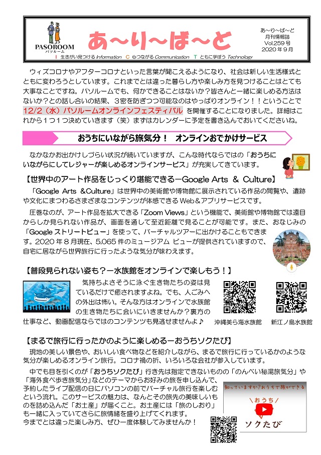 HOME > あ~り~ば~ど > あ~り~ば~ど 2020年9月号 Vol.259 あ~り~ば~ど 2020年9月号 Vol.259 今月の内容 おうちにいながら旅気分! オンラインおでかけサービス 私の散歩道 Vol.151 弥生台教室 我妻 尚美さん ★パソルームサポート通信 vol.72 LINEの「送信取り消し」機能とは?★ 今月の話題 ▼どうしてアメリカでTikTokの利用を禁止するの?▼ パソルーム倶楽部会員様向け無料講座のご案内 12/2(水) パソルームオンラインフェスティバルを開催します!