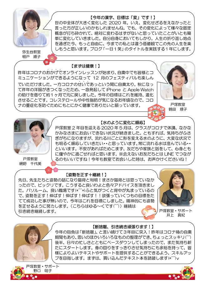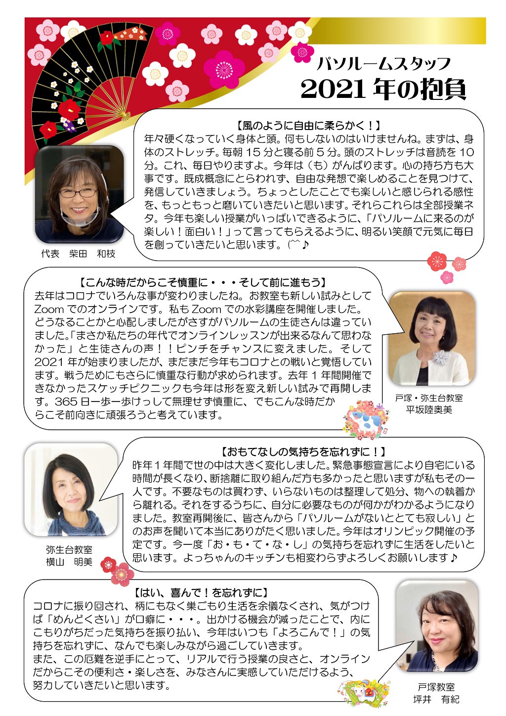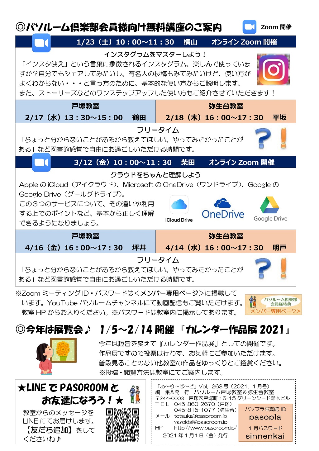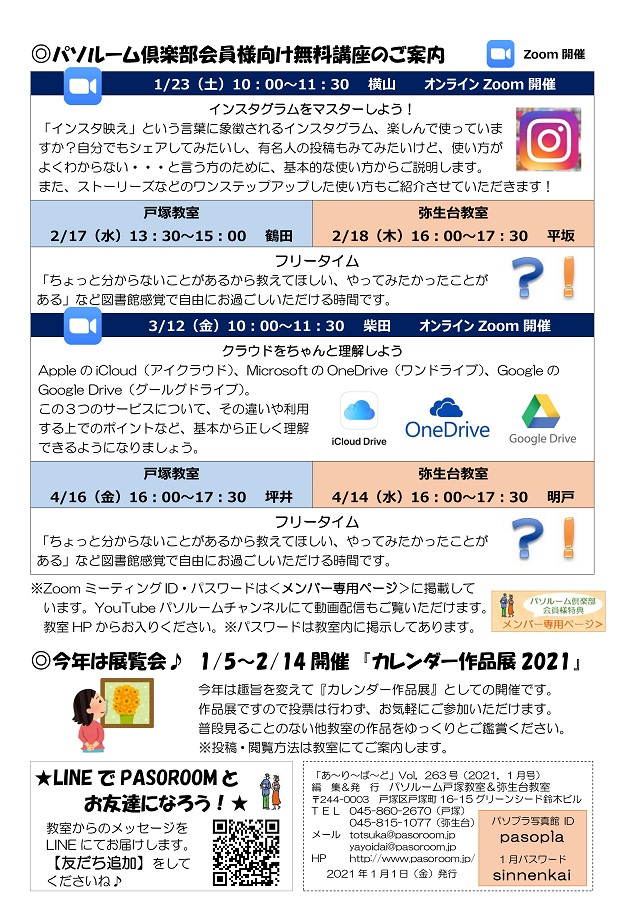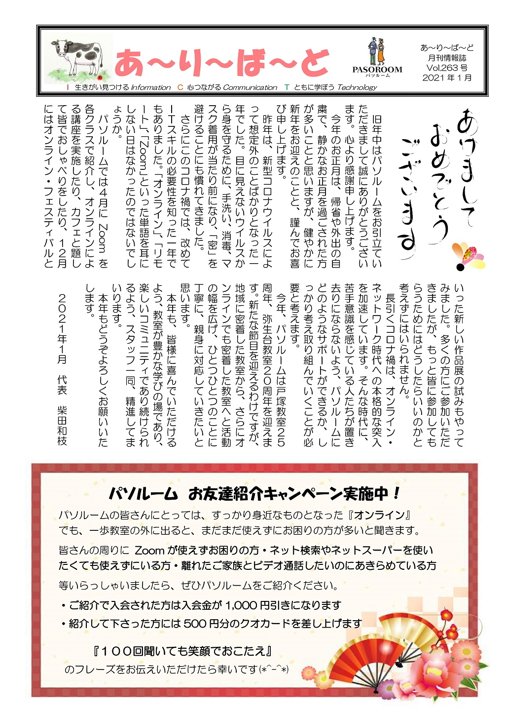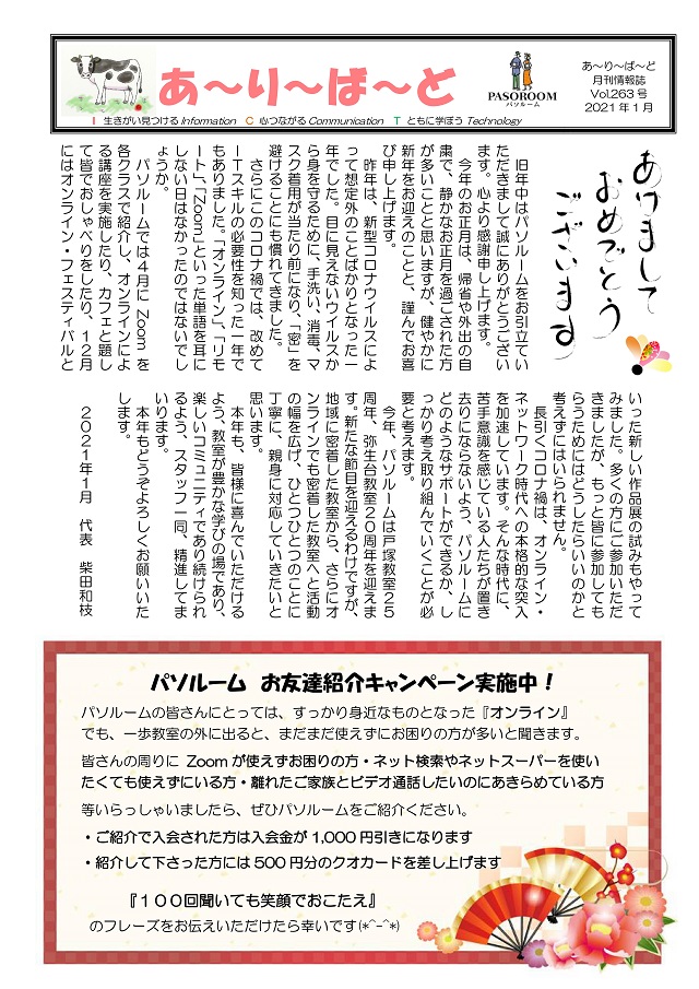 HOME > あ~り~ば~ど > あ~り~ば~ど 2021年1月号 Vol.263 あ~り~ば~ど 2021年1月号 Vol.263 今月の内容 新年のご挨拶 代表 柴田和枝 パソルーム お友達紹介キャンペーン実施中! パソルームスタッフ 2021年の抱負-1 パソルームスタッフ 2021年の抱負-2 パソルーム倶楽部会員様向け無料講座のご案内 今年は展覧会♪ 1/5~2/14開催 『カレンダー作品展2021』
