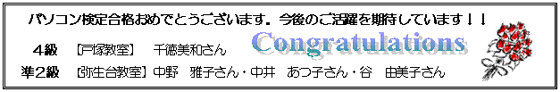 戸塚教室木曜日午前のフリーレッスンに通っていらっしゃるSさんは、写真の通り、素敵な現代女性です。授業中は熱 心にパソコンに取り組んでいて、課題を確実にこなしていかれるとっても真面目な生徒さんです。つい先日、その成果があって見事P検4級に合格されました!パソコンが全くはじめての状態から、ちょうど半年がたったところのことでした。実は私の生徒さんがP検を受験されるのは初めてのことで、合格という結果を知ったときには自分のことのように嬉しくなりました(^^)v