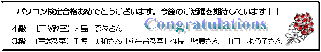 今回は、戸塚教室月曜日午後のレギュラークラスに通っていらっしゃる鰐部維久子さんのご紹介です。鰐部さんは何事にも一生懸命な方で、パソコンの勉強にもとても熱心です。毎回、予習復習を欠かさず行なっているため、着実にレベルアップしていらっしゃいます。お家ではパソコンの先輩である御主人がいらっしゃるので、色々ご相談することも多いでしょうね。御夫婦で同じ趣味 を持っているなんて、理想です(^^)