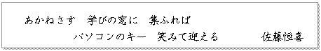主人に誘われて、初めてのパソコンを、明戸先生そして良きクラスメートとの笑顔に支えられながら、昨年九月から始めて今では七歳の孫にまで「お婆ちゃんは偉い、お婆ちゃんは若いよ(顔が若いのではありませんよ)」と励まされ心良くした六十の手習いの私は、コツコツと毎日楽しくパソコンに向かい、にらめっこの日々を送っている今日この頃です。