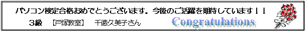 レギュラーコースの中のワードを始めてから作品作りに目覚め、孫と一緒にパン作りをすると共に、パソコンと言う趣味が増えた事で、孫に教えられる喜びが増し、もう一段上の作品に挑戦する意欲を燃やしている私です。機械音痴の私がパソコンを操っている事に密かに不思議がっている主人?こんなに楽しく、パソコンに浸るとは夢にも思いませんでした。やる気を沸き立たせてくれたのも、百回質問のキャッチフレーズの下、多々有る質問にも笑顔で答えて下さり、そして楽しく授業が受けられた事で意欲が沸いたのだと思い先生と良きクラス メートの御陰様と感謝致しております。