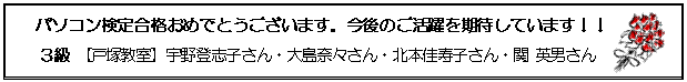 戸塚教室PCマスター3級の4期生が4月23日(月)に認定試験を受け、受講生4名全員合格となりました。おめでとうございます。今後のご活躍を期待しています。