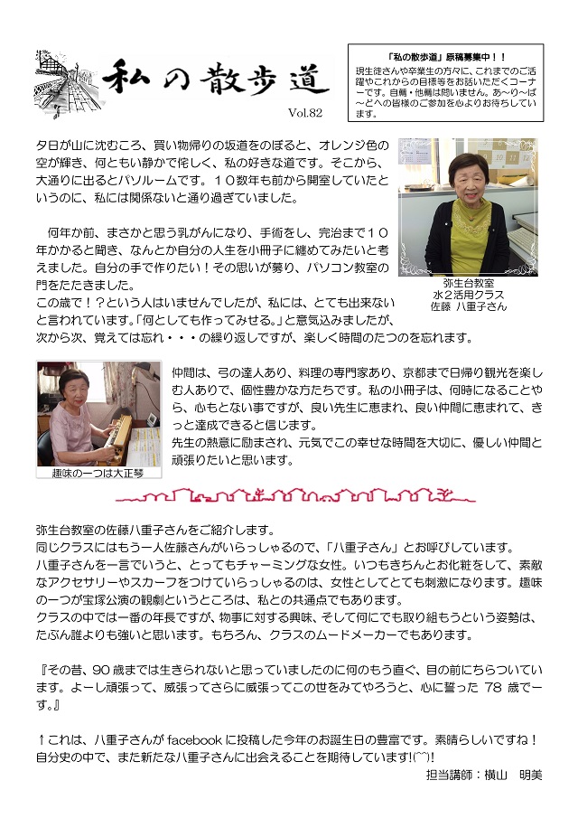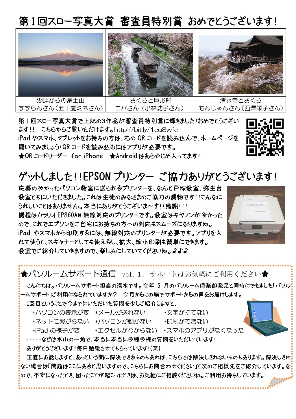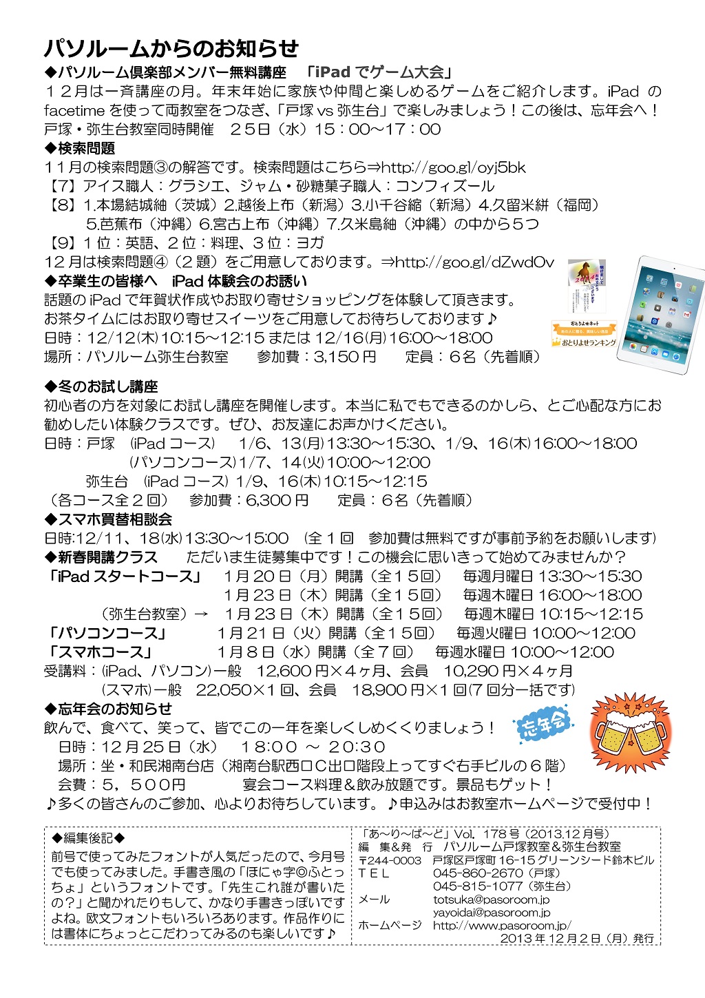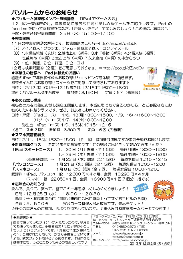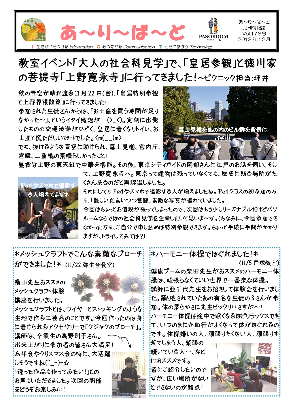 HOME > あ~り~ば~ど > あ~り~ば~ど 2013年12月号 Vol.178 あ~り~ば~ど 2013年12月号 Vol.178 今月の内容 「皇居参観」と徳川家の菩提寺「上野寛永寺」に行ってきました! メッシュクラフト&ハーモニー体操のご報告 第1回スロー写真大賞 審査員特別賞 おめでとうございます!★パソルームサポート通信 vol.1.サポートはお気軽にご利用ください★ 私の散歩道 弥生台教室 佐藤 八重子さん パソルームからのお知らせ