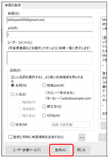 ③【単語】にメールアドレスを、【よみ】に頭文字を入力し、【登録】をクリックします。