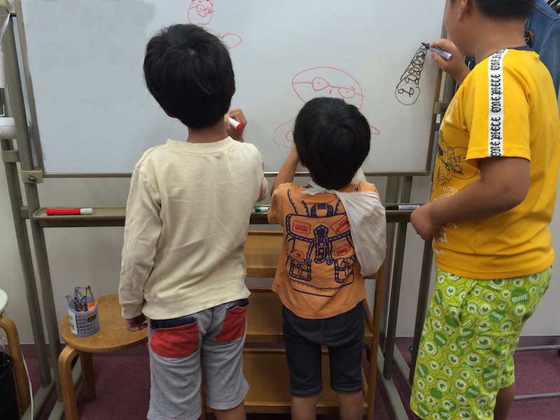 ホワイドボードに落書きをしたり(1歳違いなのに、これだけの身長差があります)