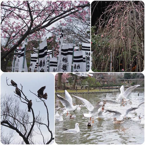 源氏池では、ゆりかもめ、白鳩、鴨等の乱舞する様子を