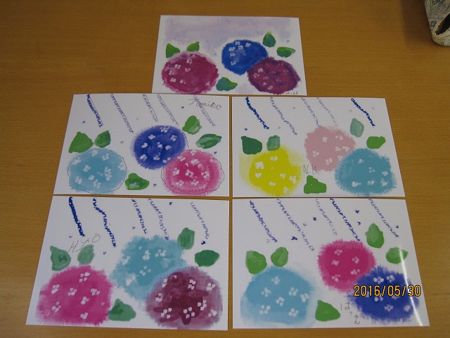 各自好きな三色のあじさいの色をチョイスし、それを塗っていくお道具は刷毛です。