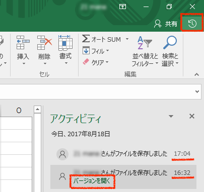右上の履歴「アクティビティ」ボタン(時計のような形をしたボタン)をクリックすると、履歴が表示されます。「バージョンを開く」をクリックすると、過去のバージョンのファイルを復元することができます。