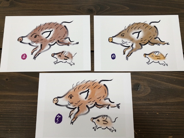 皆さんの仕上がりをみると下絵は同じでもみんな違ったいのししの親子となります。